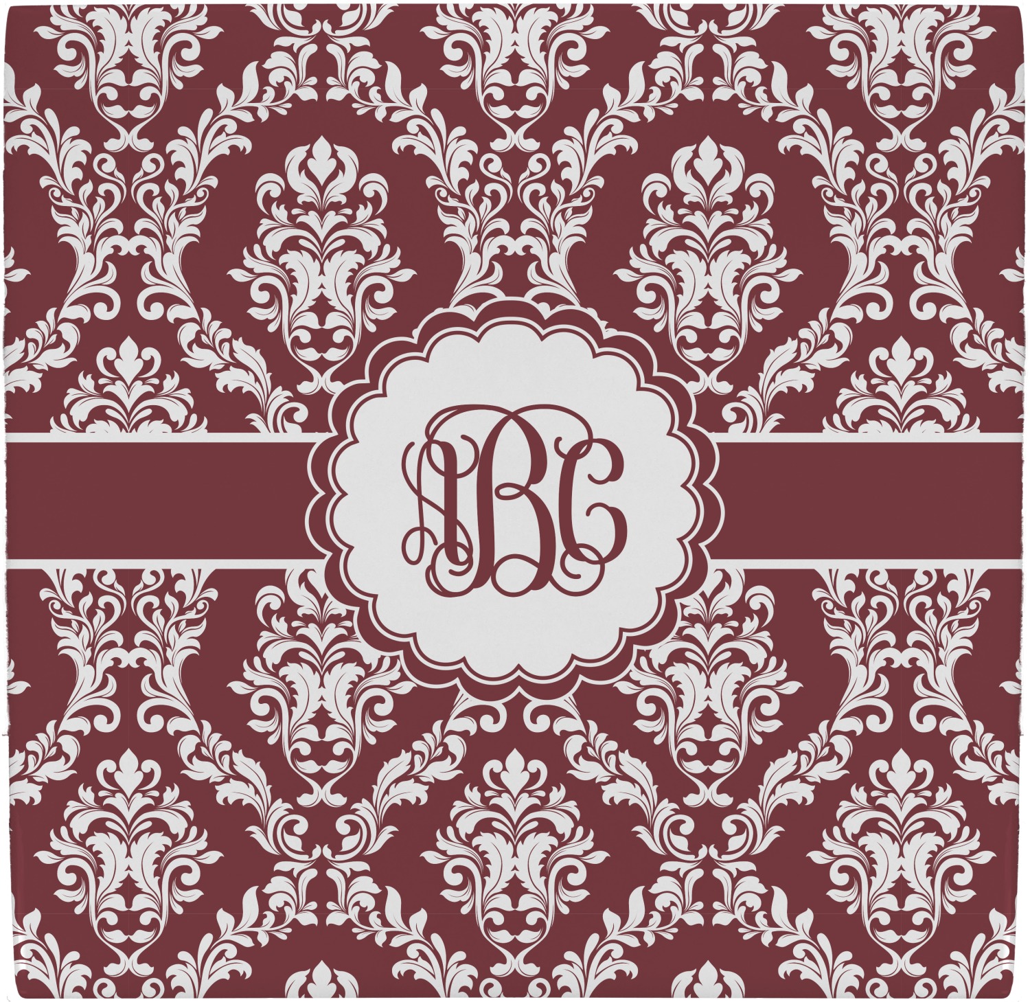 Maroon & White create a great combination. This simple, yet elegant design features our popular damask with a ribbon and an interlocking monogram in a scalloped label.