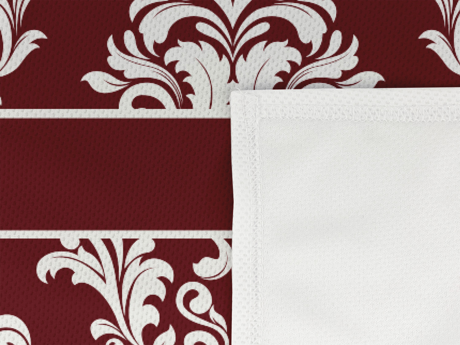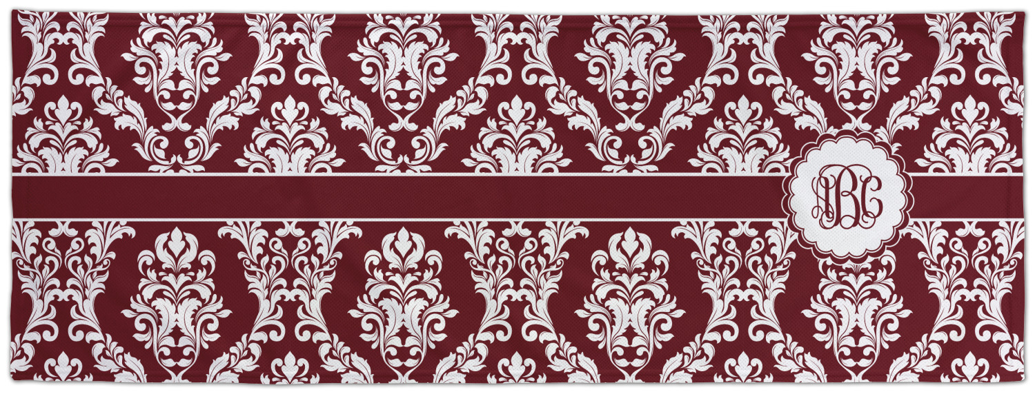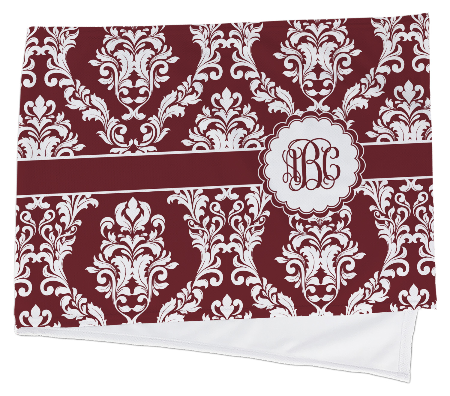 Maroon & White create a great combination. This simple, yet elegant design features our popular damask with a ribbon and an interlocking monogram in a scalloped label.