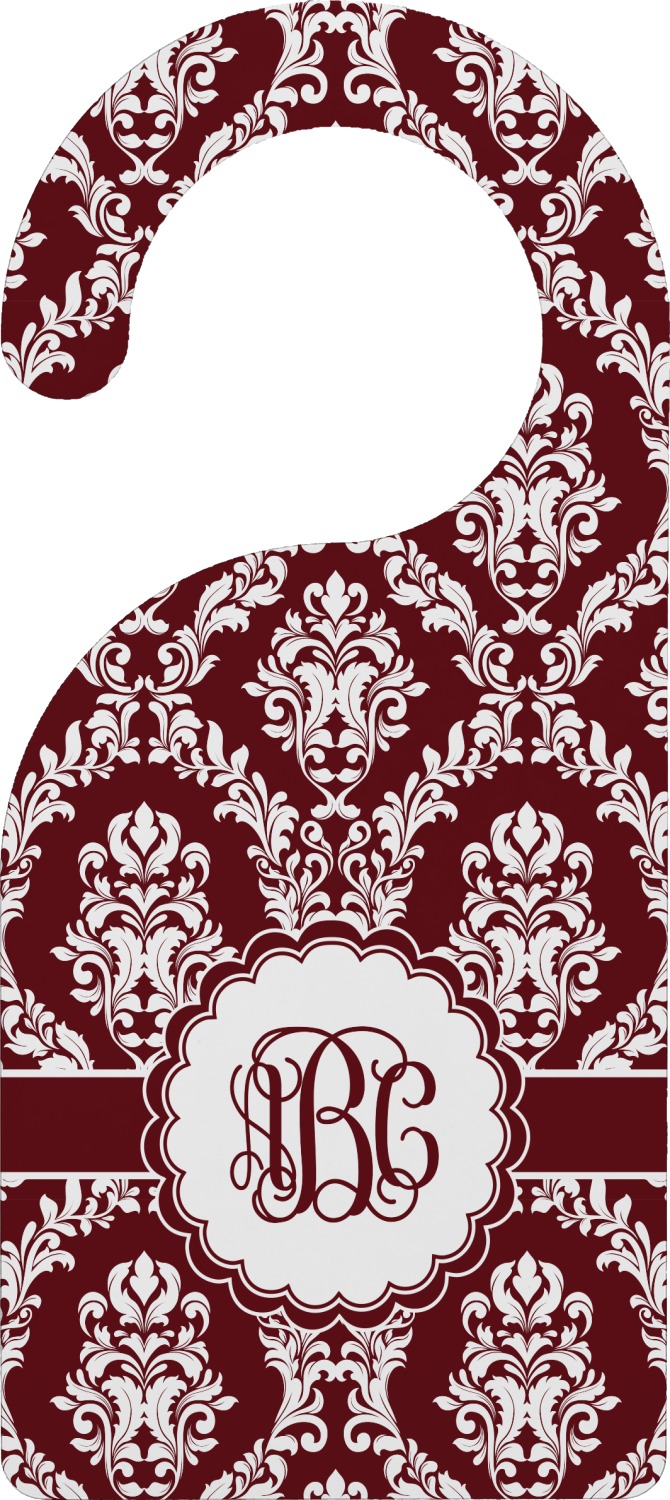 Maroon & White create a great combination. This simple, yet elegant design features our popular damask with a ribbon and an interlocking monogram in a scalloped label.