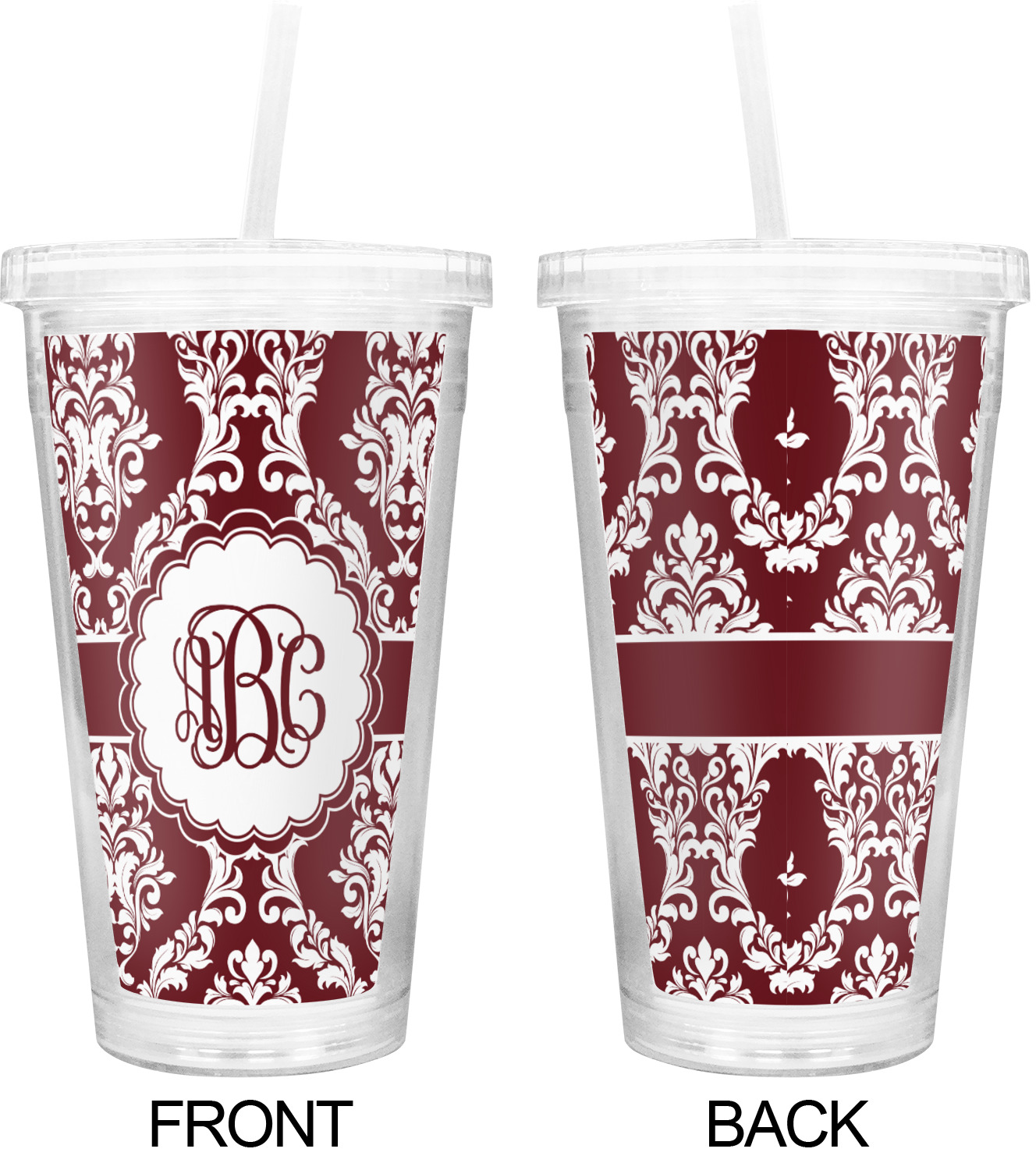 Maroon & White create a great combination. This simple, yet elegant design features our popular damask with a ribbon and an interlocking monogram in a scalloped label.