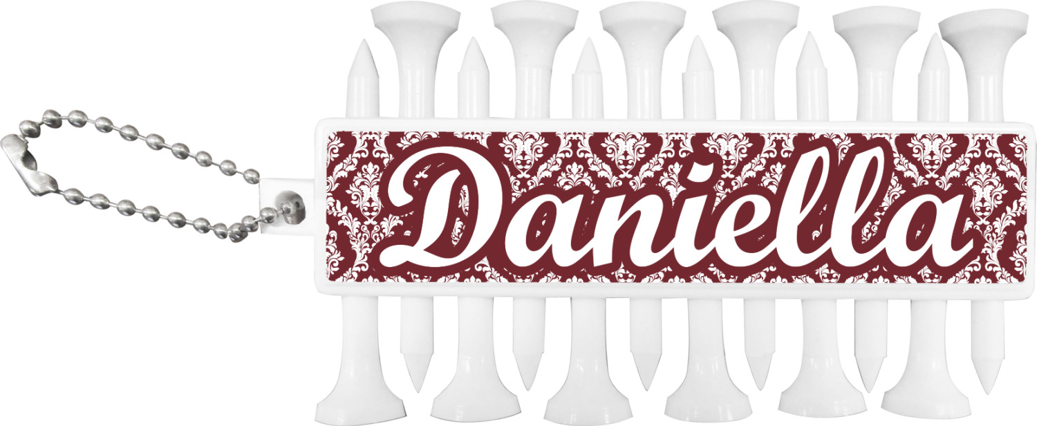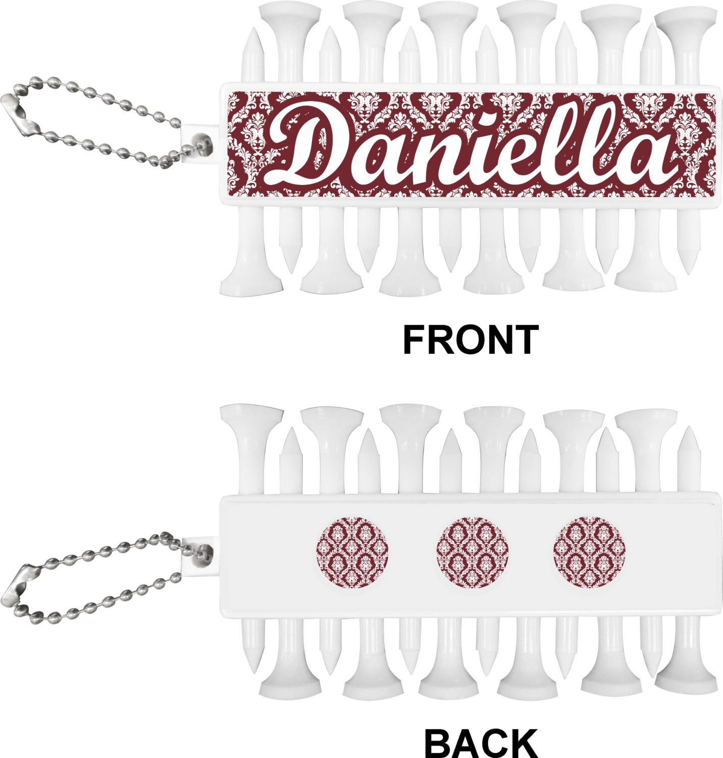 With 12 tees on a lightweight, portable key chain, it almost ensures a great 18 holes. Our tees are made of white plastic and are a little over 2". Design the front and the back of the golf tee holder. Pick from over a hundred designs, colors, and personalization styles! The set even comes with three removable ball markers as well!
