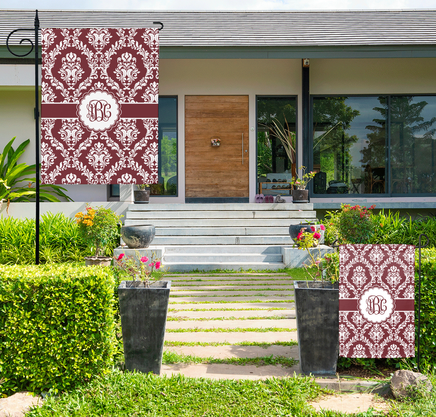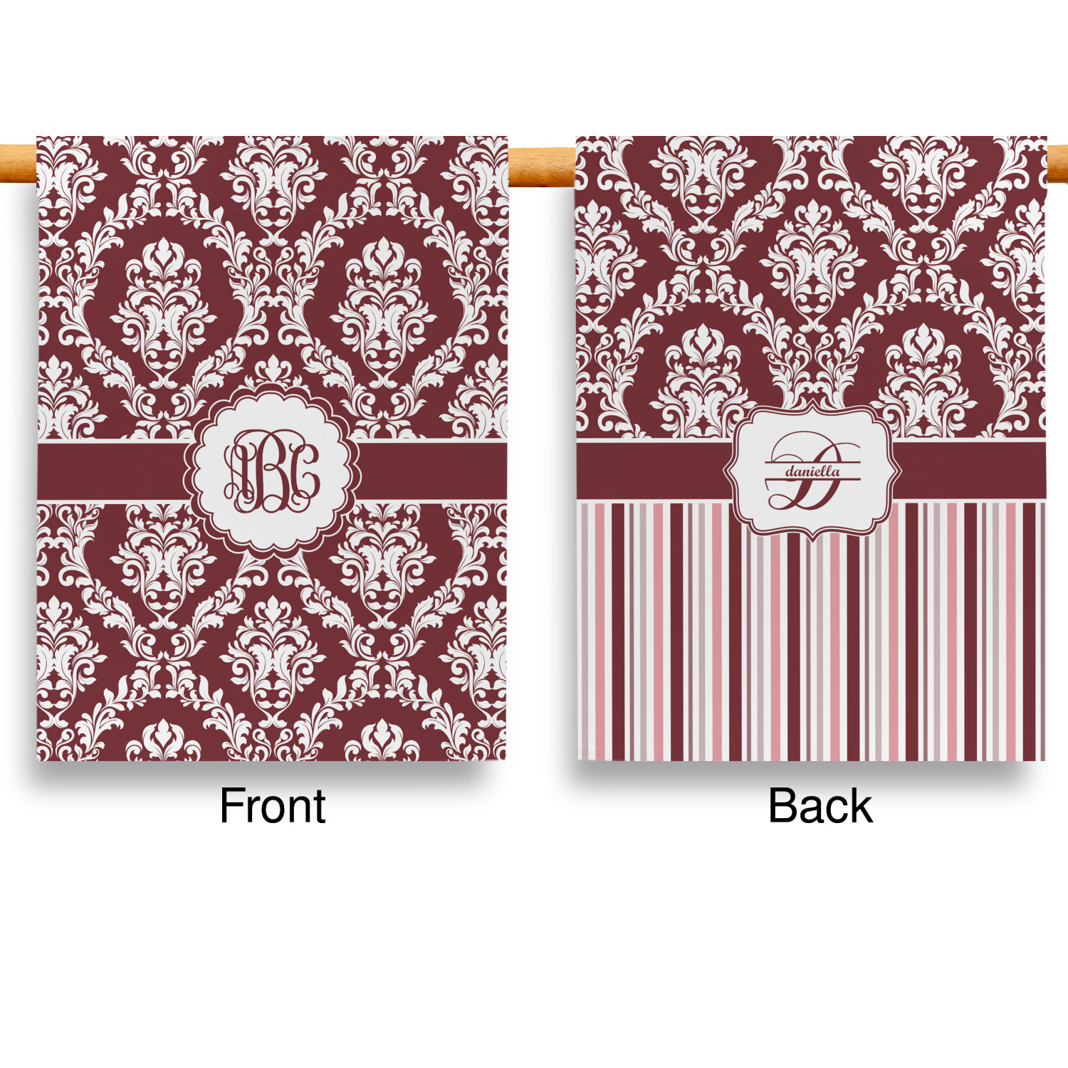 These custom garden flags are made of a durable, double-ply, polyester weave, allowing them to withstand the elements year round. The small flags measure at approximately 12 by 18 inches. The large flags measure out to 28 by 37 inches. You can order these decorative flags with your customization printed on the front only, or the front and back.