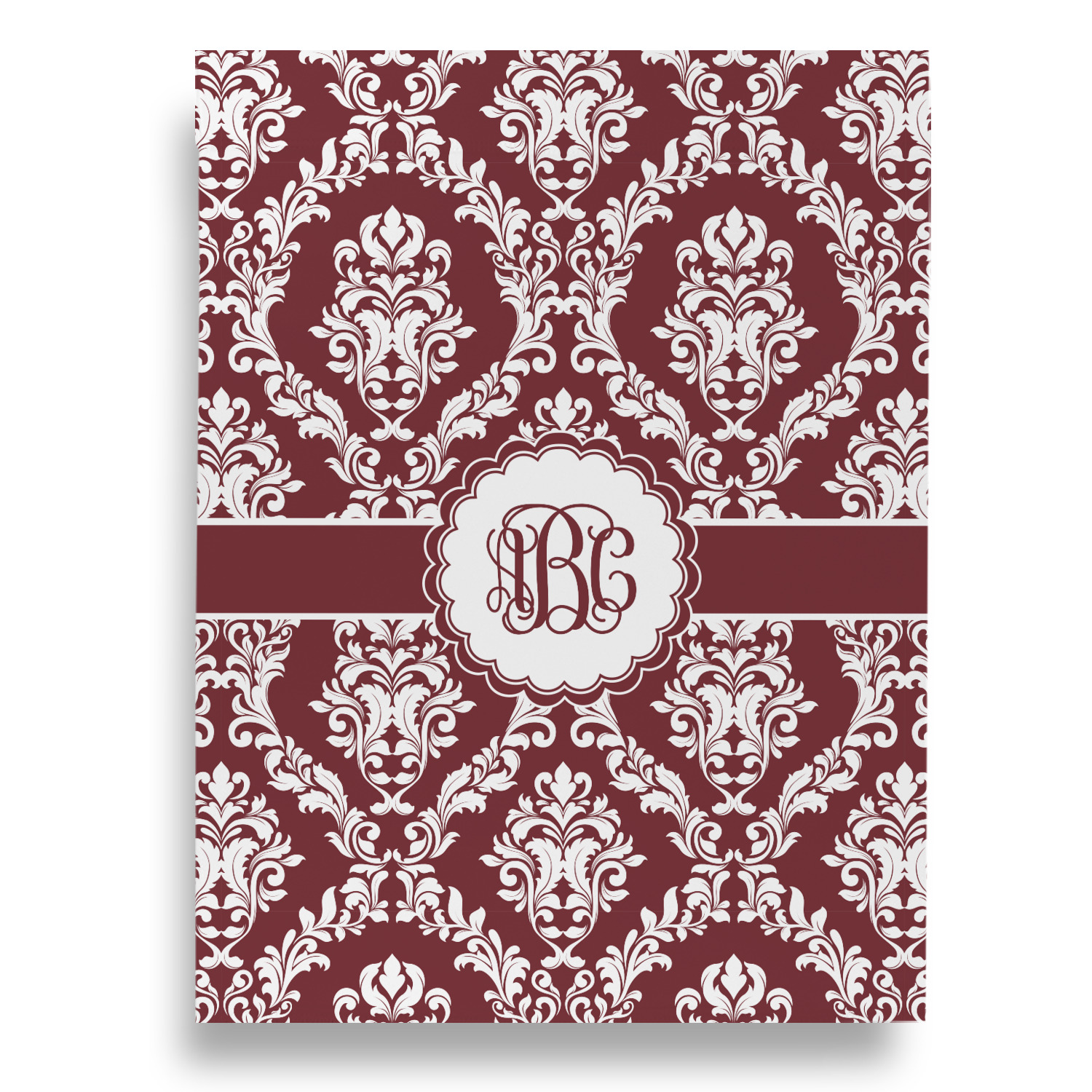 Maroon & White create a great combination. This simple, yet elegant design features our popular damask with a ribbon and an interlocking monogram in a scalloped label.