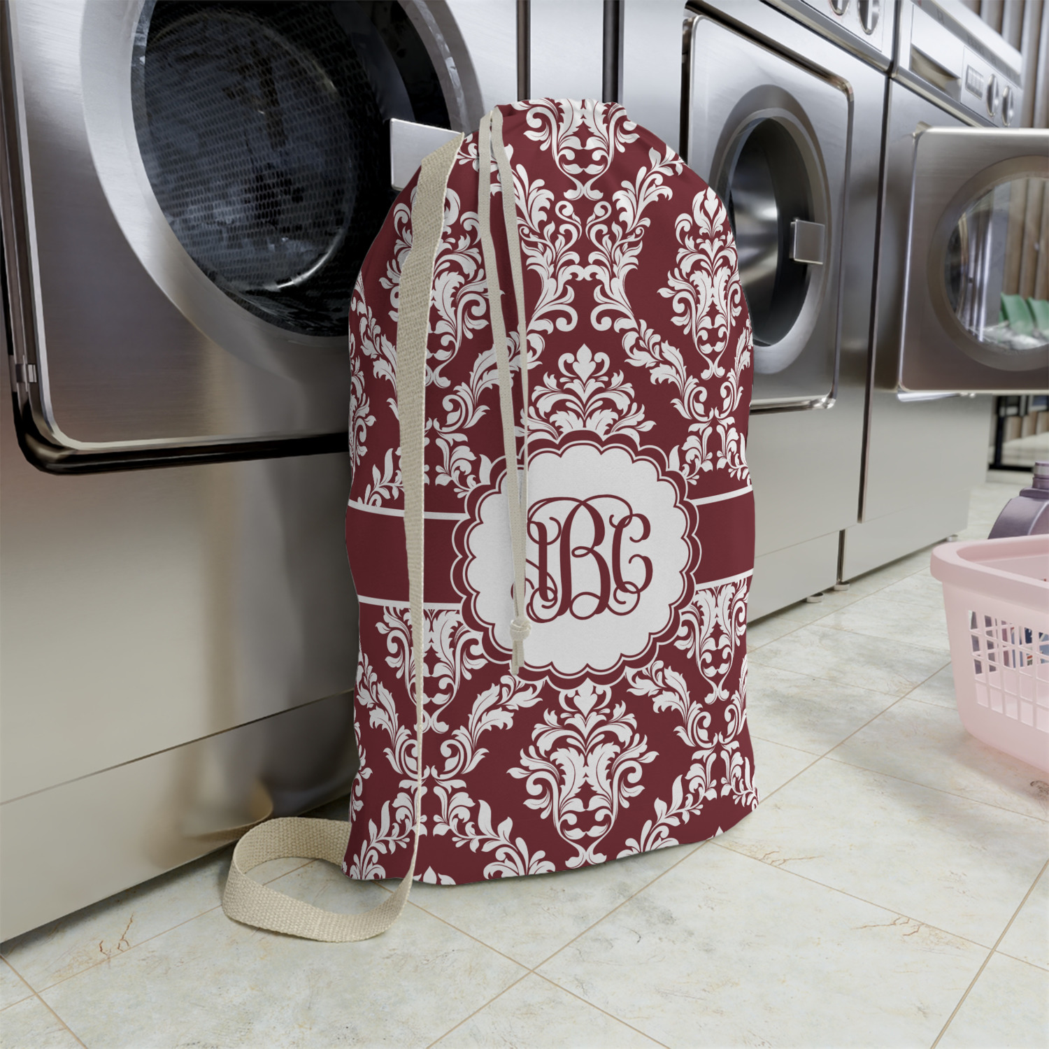 Carry your laundry in style with these customized laundry bags. Available in two sizes, featuring a natural colored woven strap and a cinch cord, these bags hold a lot of clothes or anything else you want to fit in them.