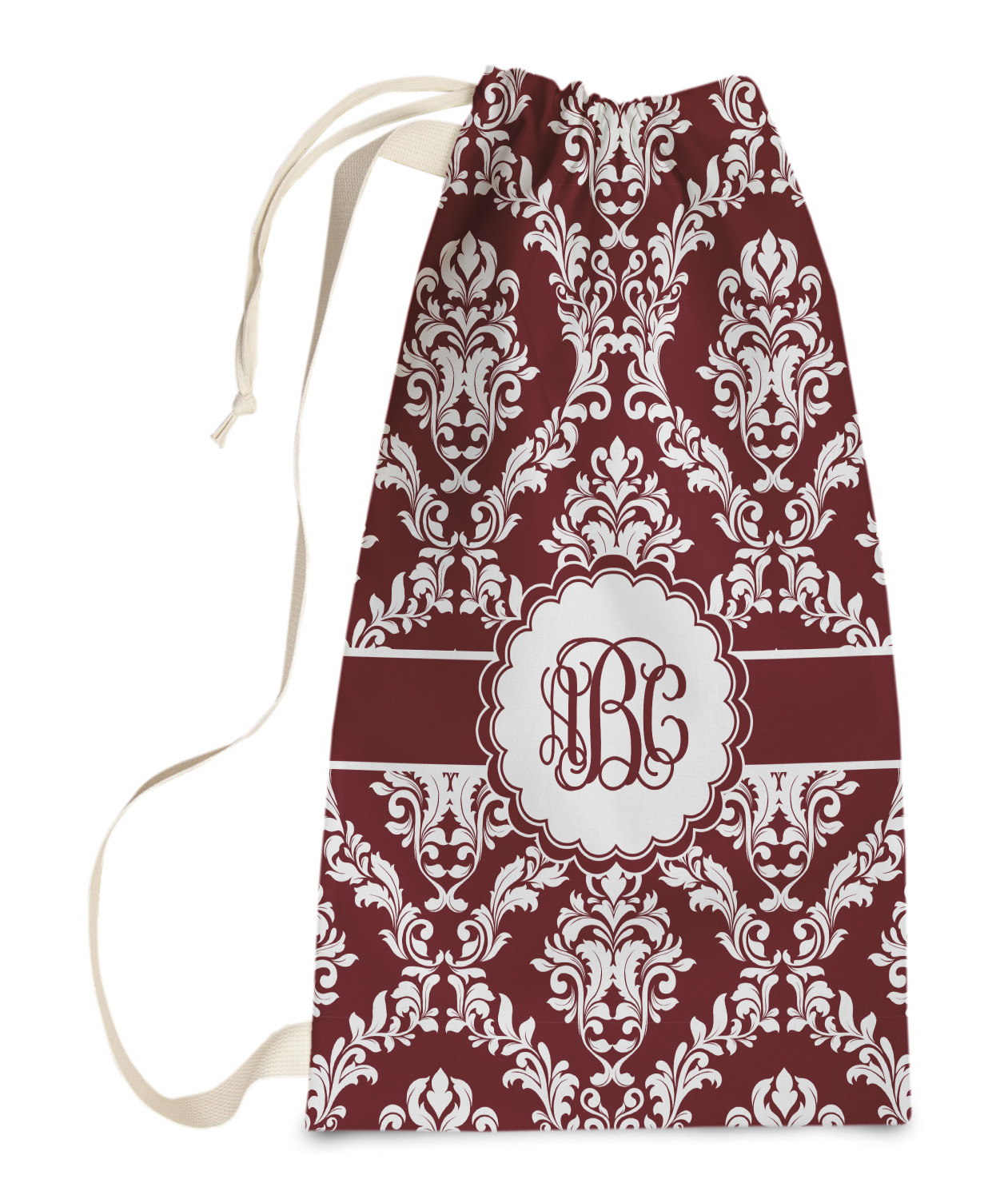 Carry your laundry in style with these customized laundry bags. Available in two sizes, featuring a natural colored woven strap and a cinch cord, these bags hold a lot of clothes or anything else you want to fit in them.