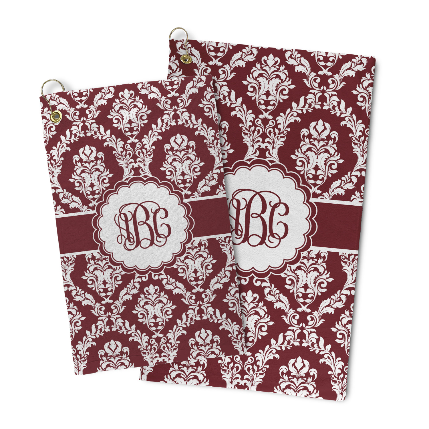 Maroon & White create a great combination. This simple, yet elegant design features our popular damask with a ribbon and an interlocking monogram in a scalloped label.