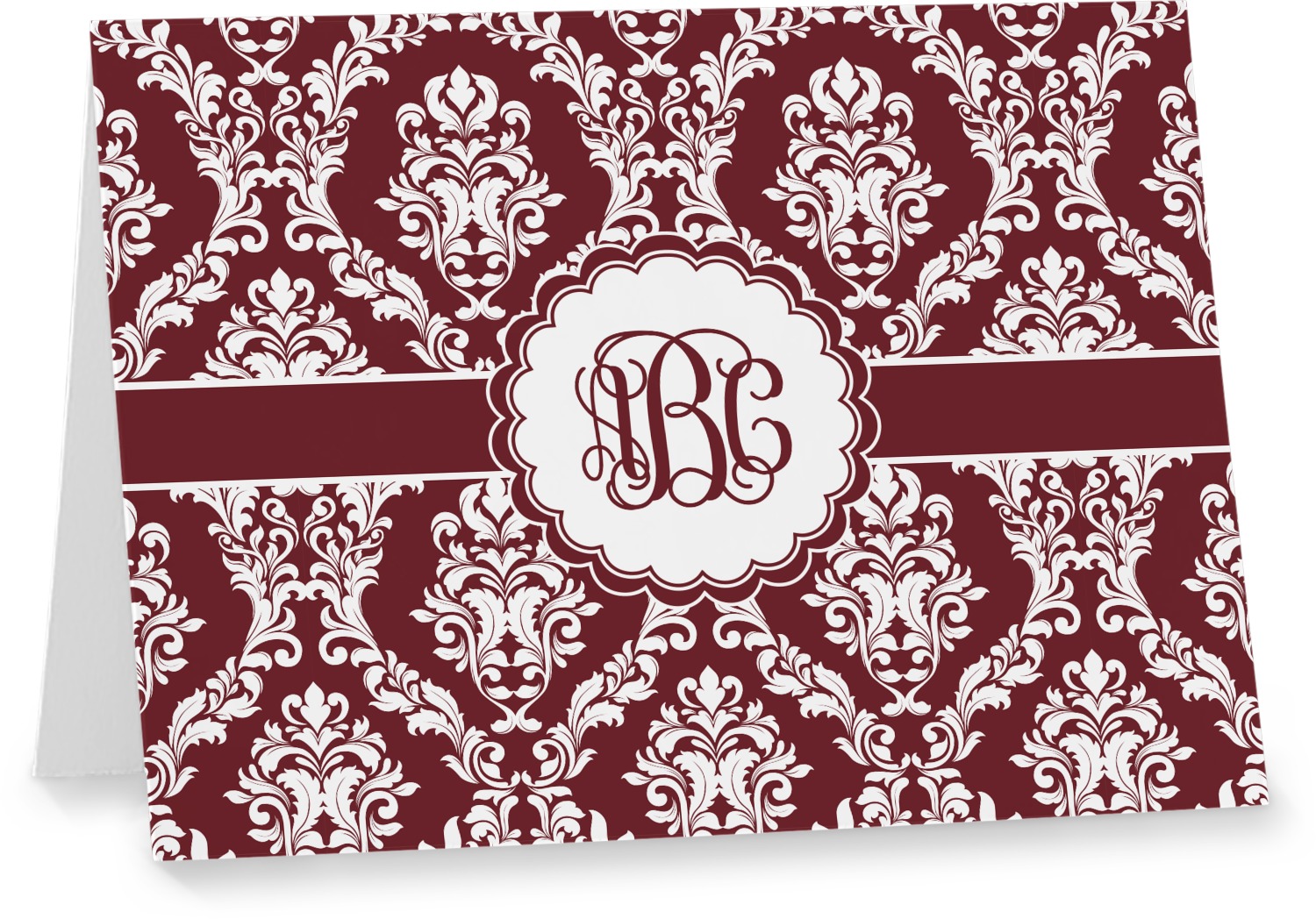 Maroon & White create a great combination. This simple, yet elegant design features our popular damask with a ribbon and an interlocking monogram in a scalloped label.
