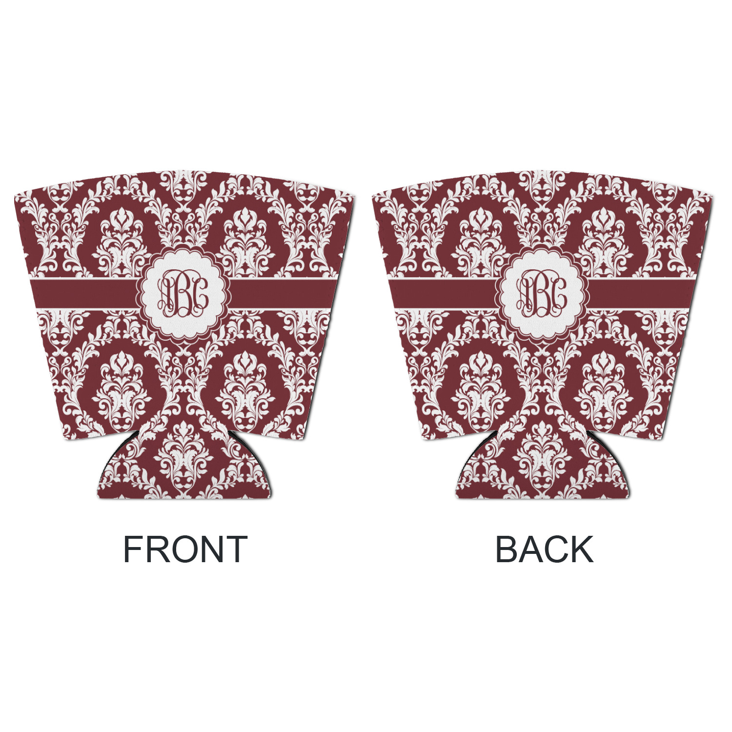 Maroon & White create a great combination. This simple, yet elegant design features our popular damask with a ribbon and an interlocking monogram in a scalloped label.