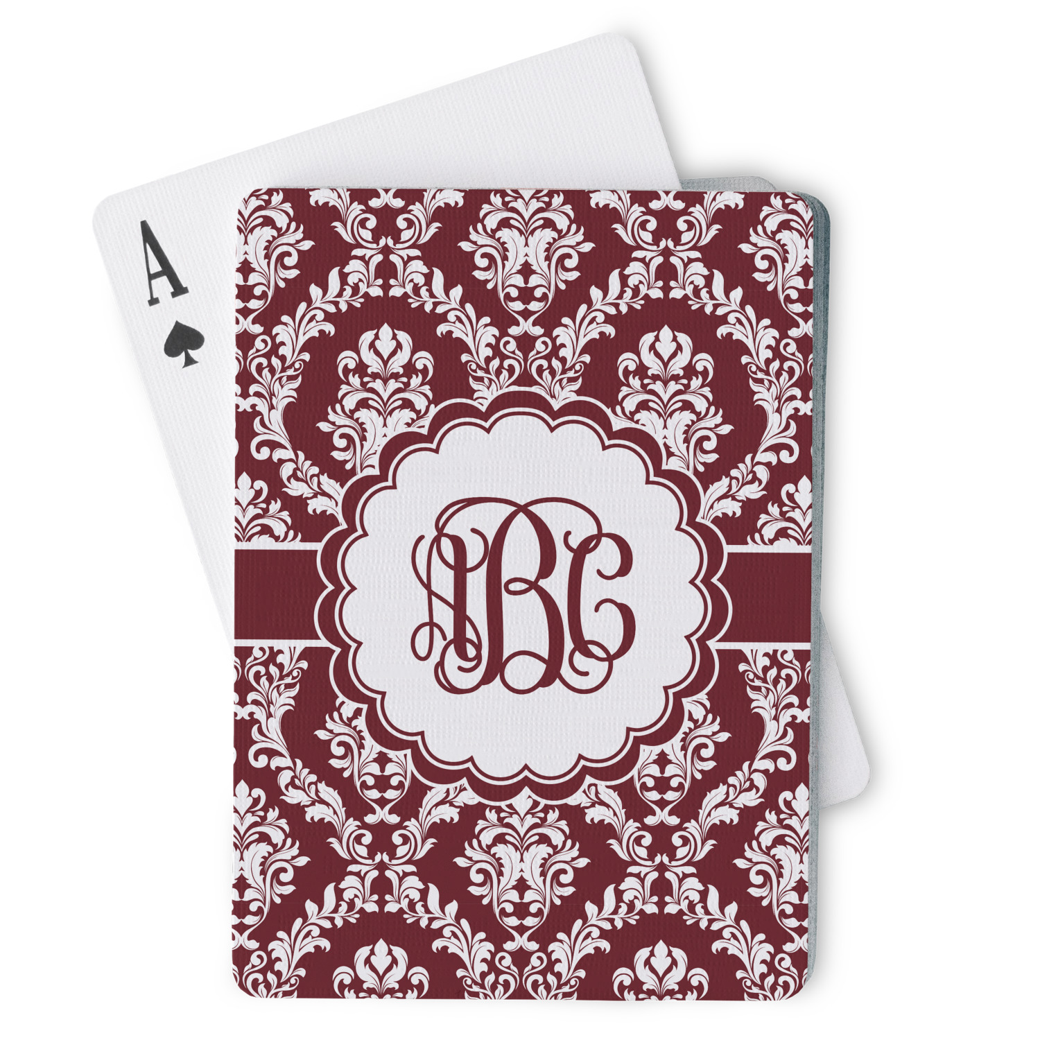 Maroon & White create a great combination. This simple, yet elegant design features our popular damask with a ribbon and an interlocking monogram in a scalloped label.