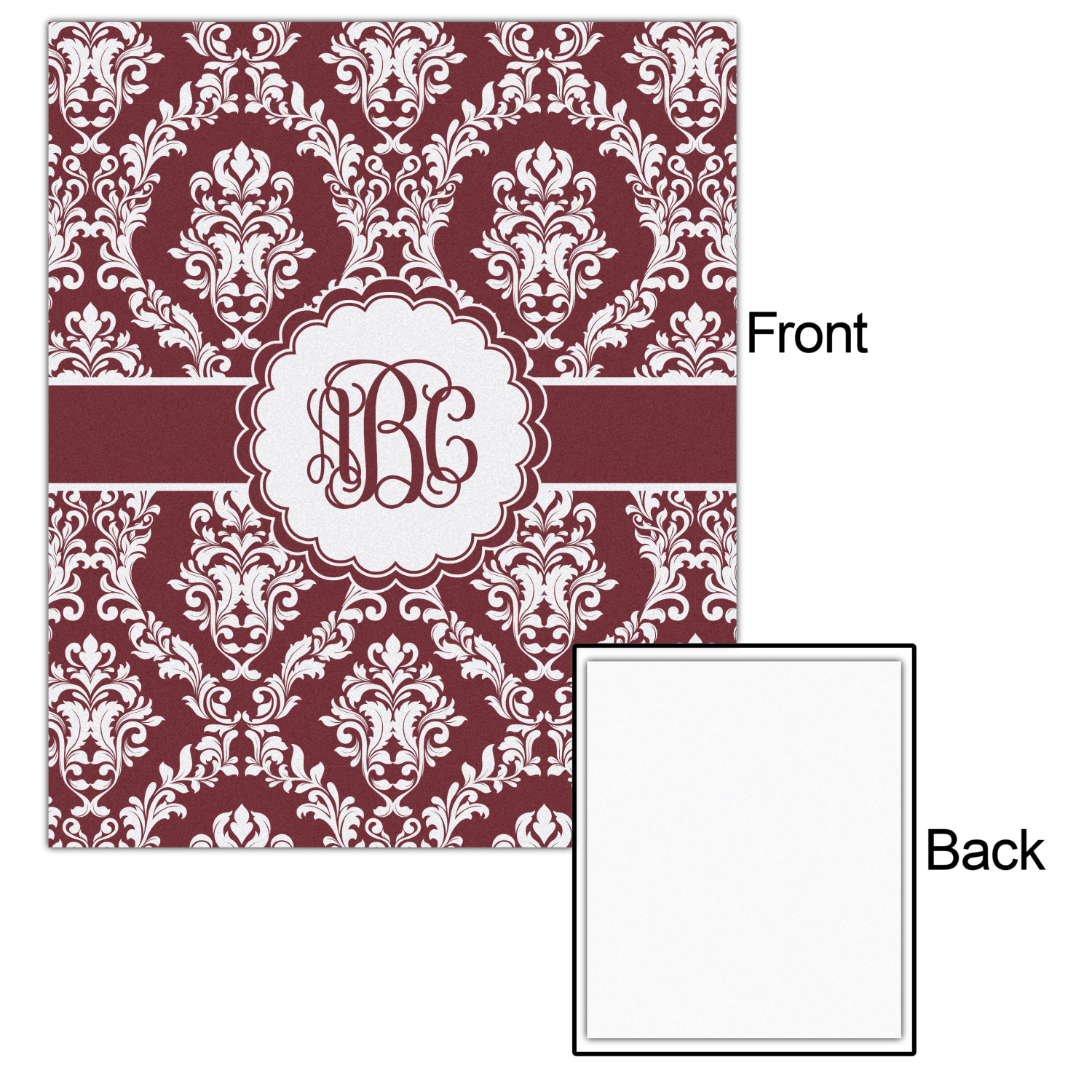 Maroon & White create a great combination. This simple, yet elegant design features our popular damask with a ribbon and an interlocking monogram in a scalloped label.