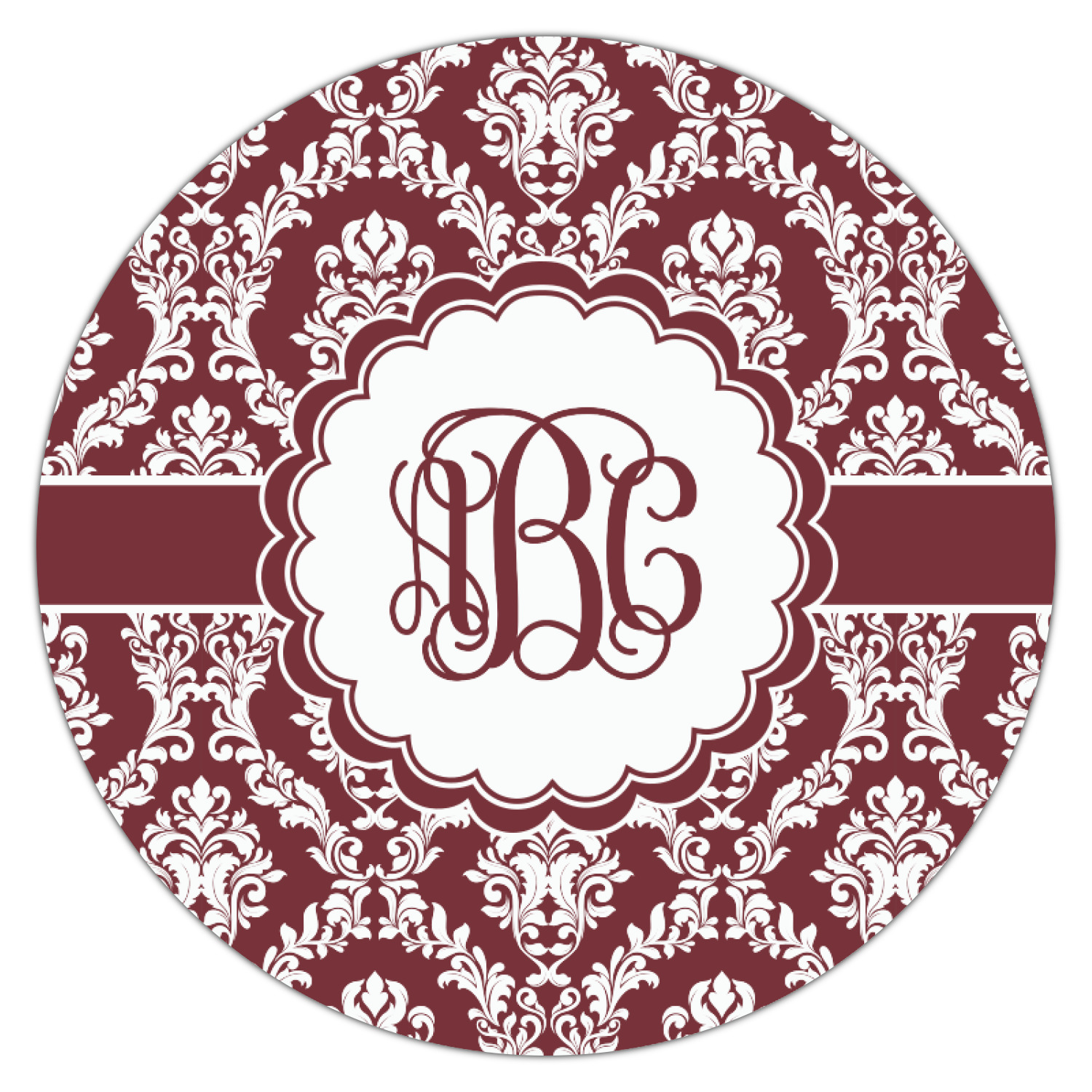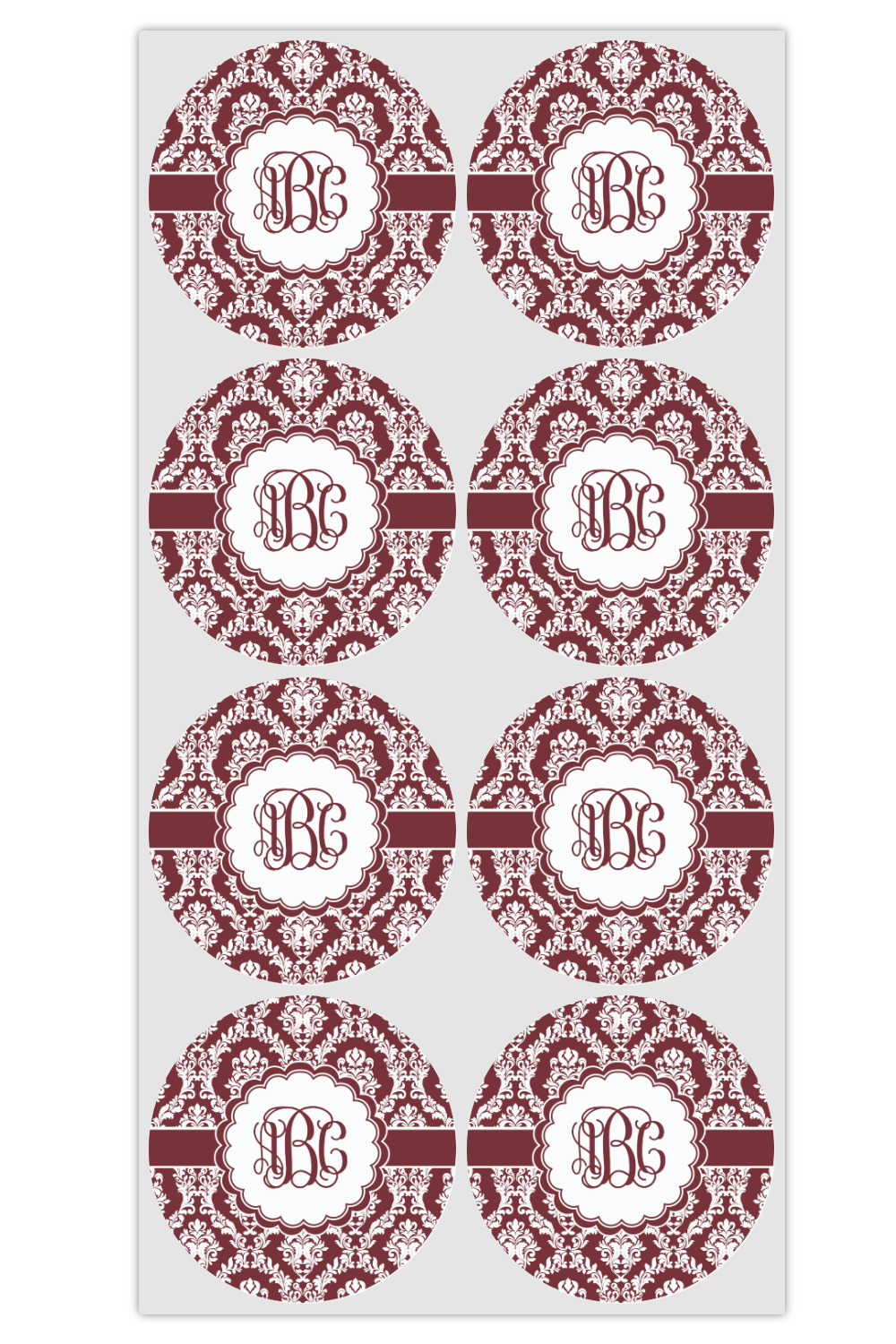 Maroon & White create a great combination. This simple, yet elegant design features our popular damask with a ribbon and an interlocking monogram in a scalloped label.