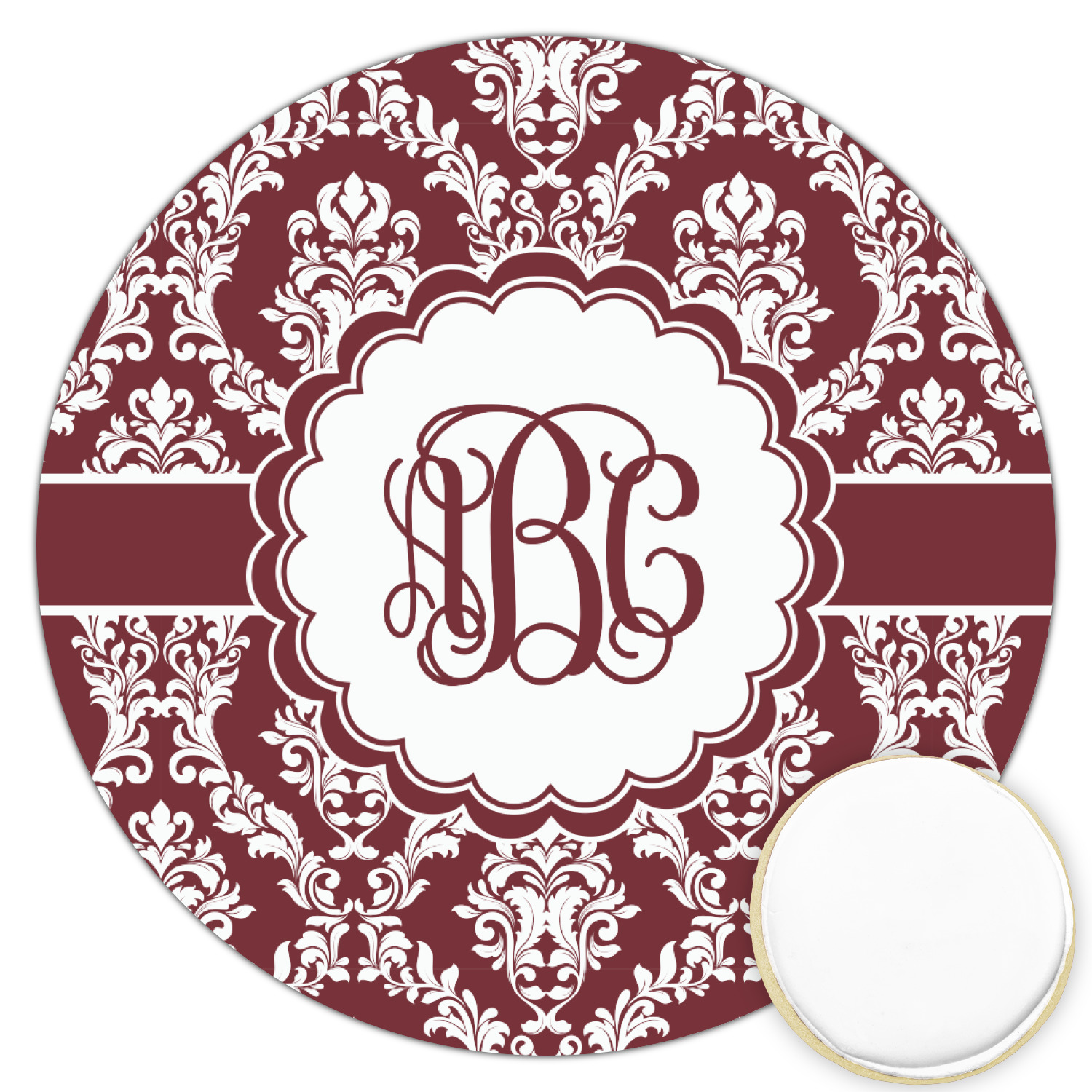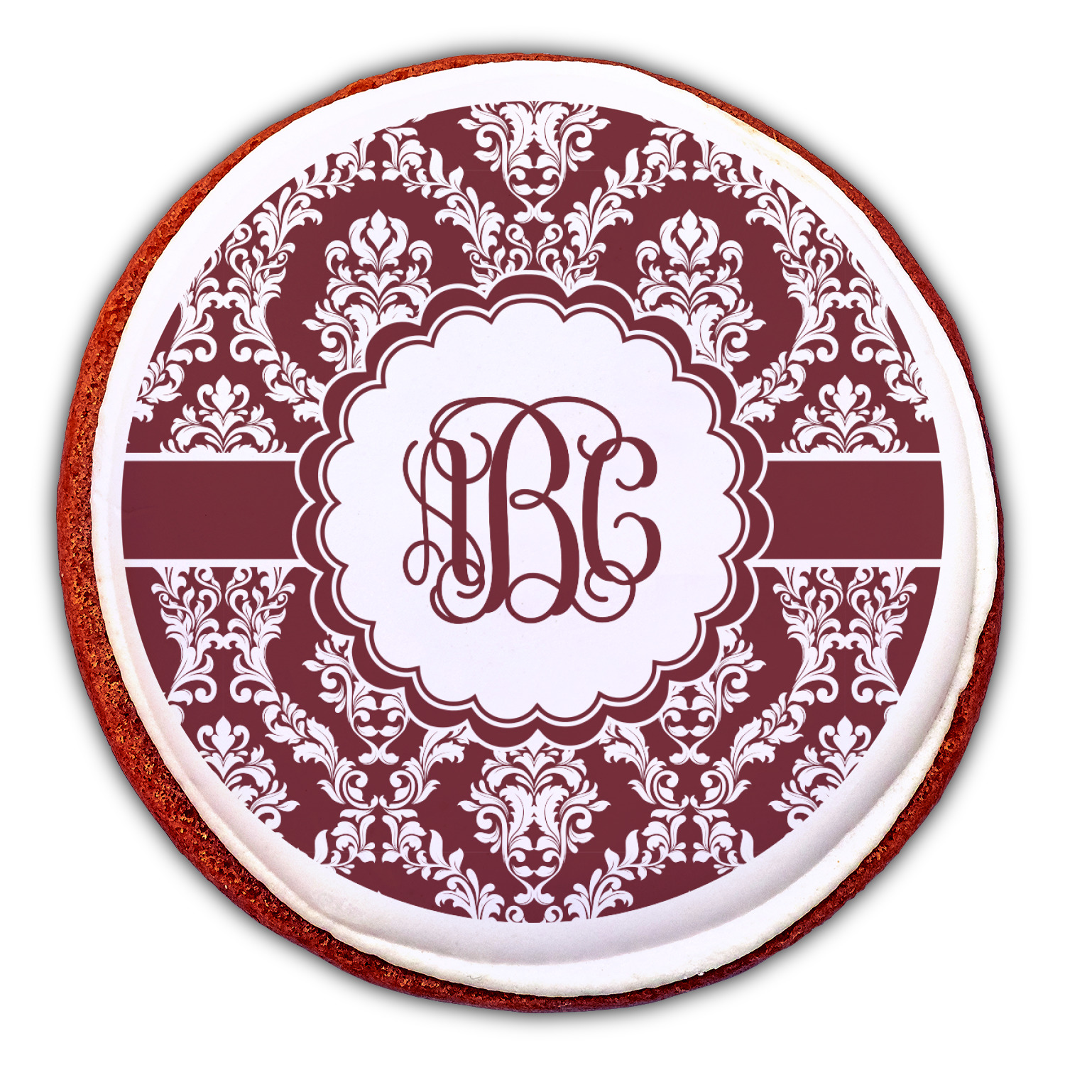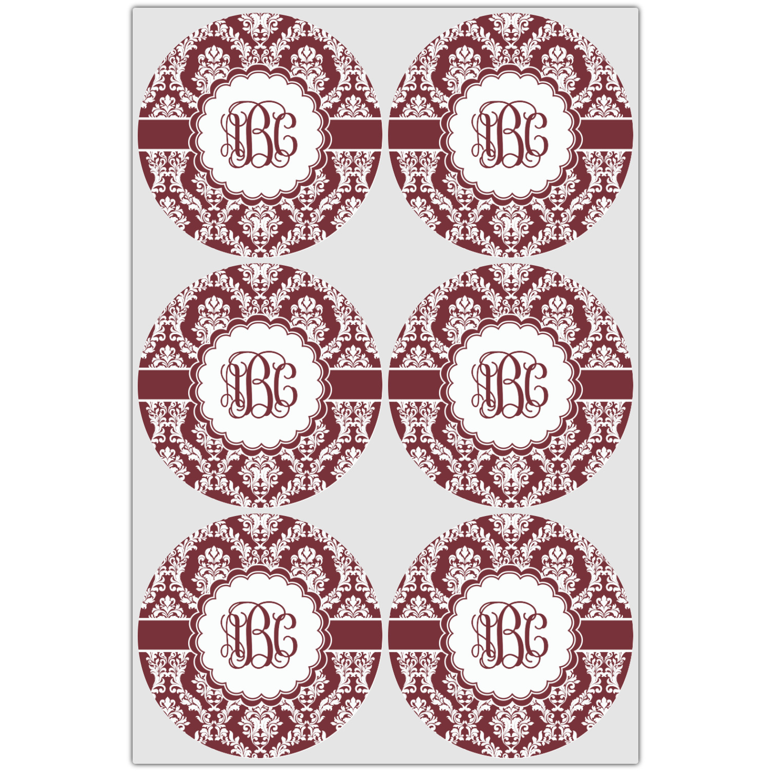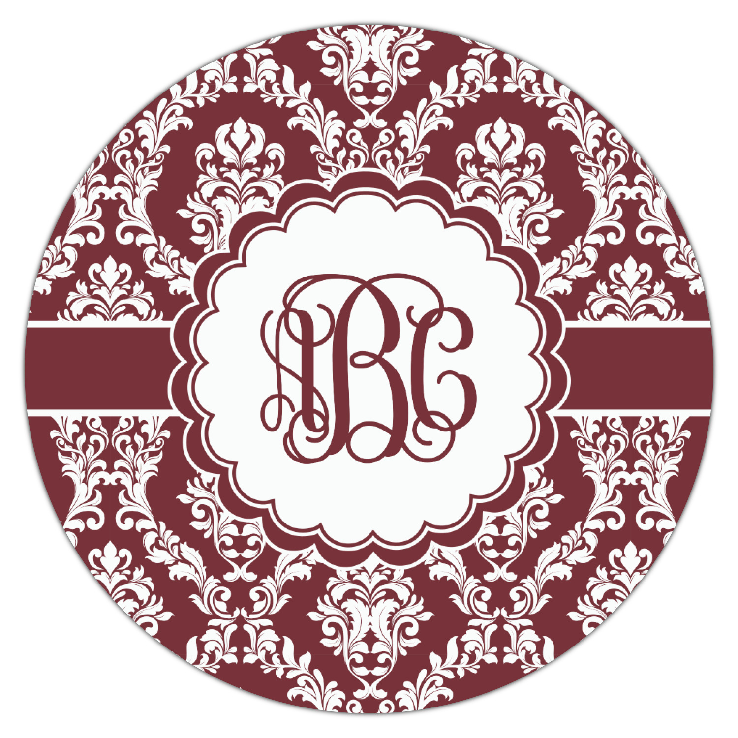 Maroon & White create a great combination. This simple, yet elegant design features our popular damask with a ribbon and an interlocking monogram in a scalloped label.
