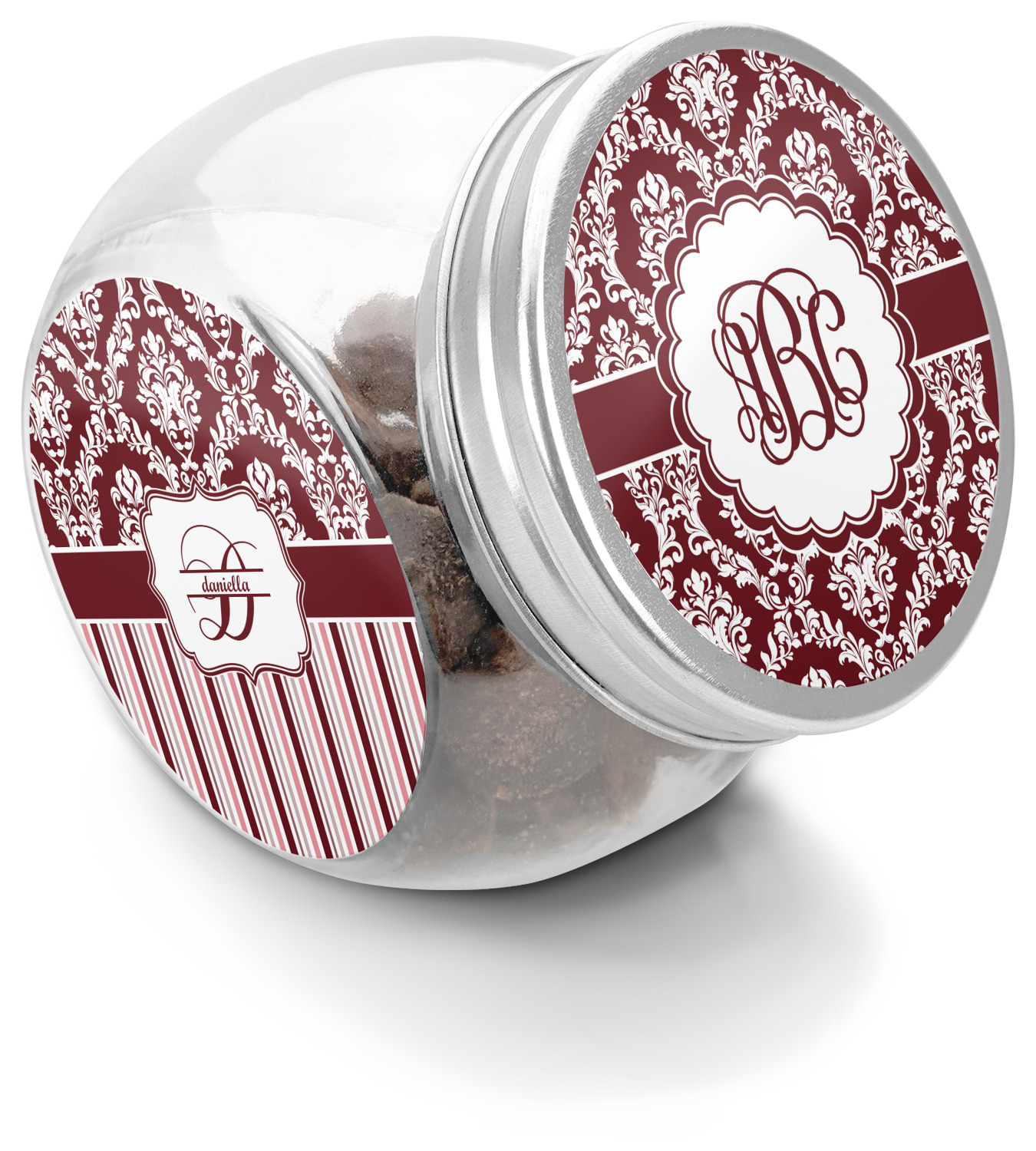 This treat jar is an excellent way to store treats for your favorite canine or feline. Moreover, their delicate, classy appearance makes them a tasteful addition to your countertop's décor. Crafted from clear glass, its unique construction and silver metal, screw-on lid allows for quick and easy access. Three, permanent, vinyl stickers are applied to both sides of the jar and lid, presenting your personalized design. The base of this glass, dog treat jar is 3.4" x 4.75", and the jar stands at 5" tall. Though on the smaller side, this jar is best suited for smaller treats or training treats.