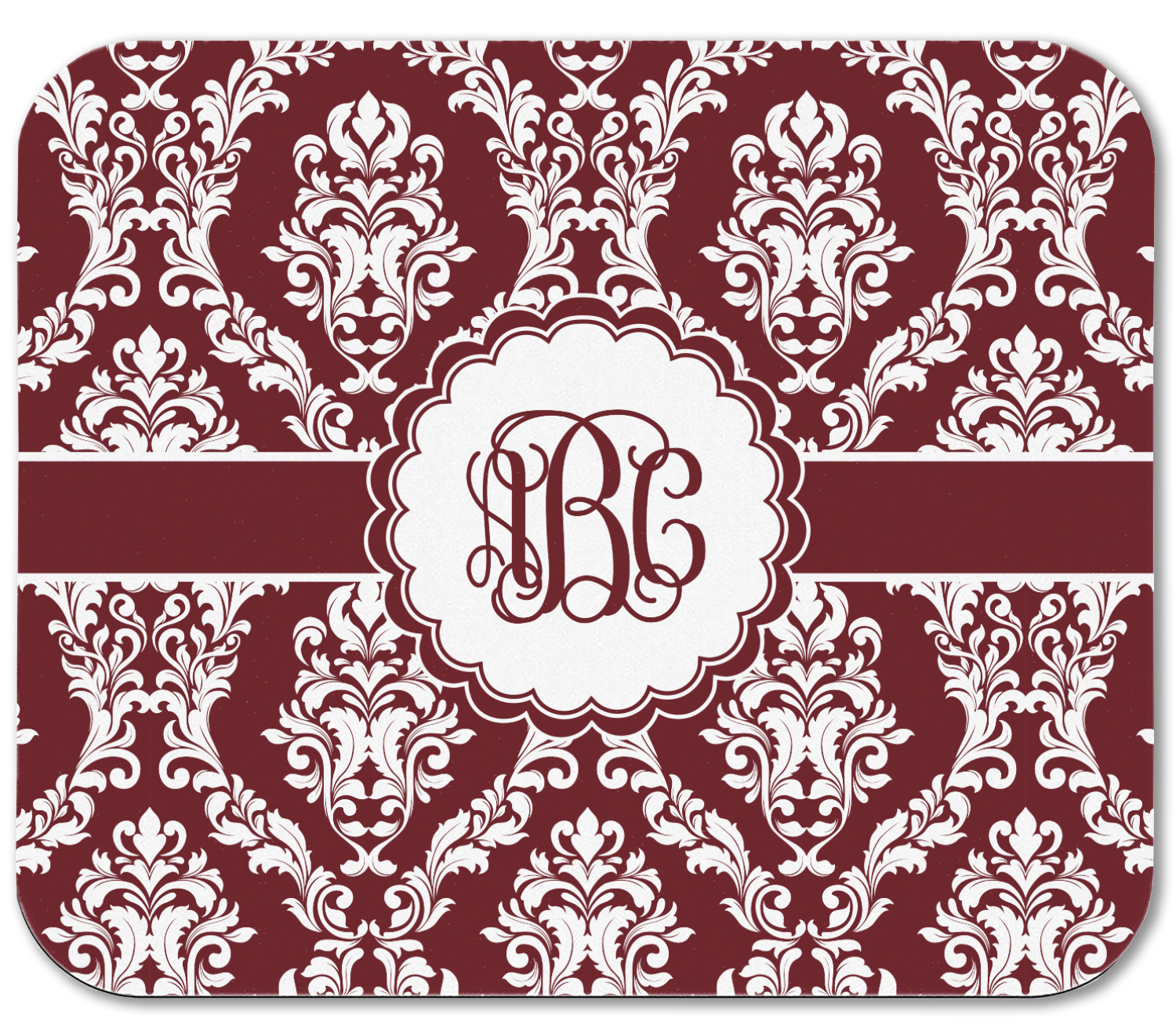 Maroon & White create a great combination. This simple, yet elegant design features our popular damask with a ribbon and an interlocking monogram in a scalloped label.