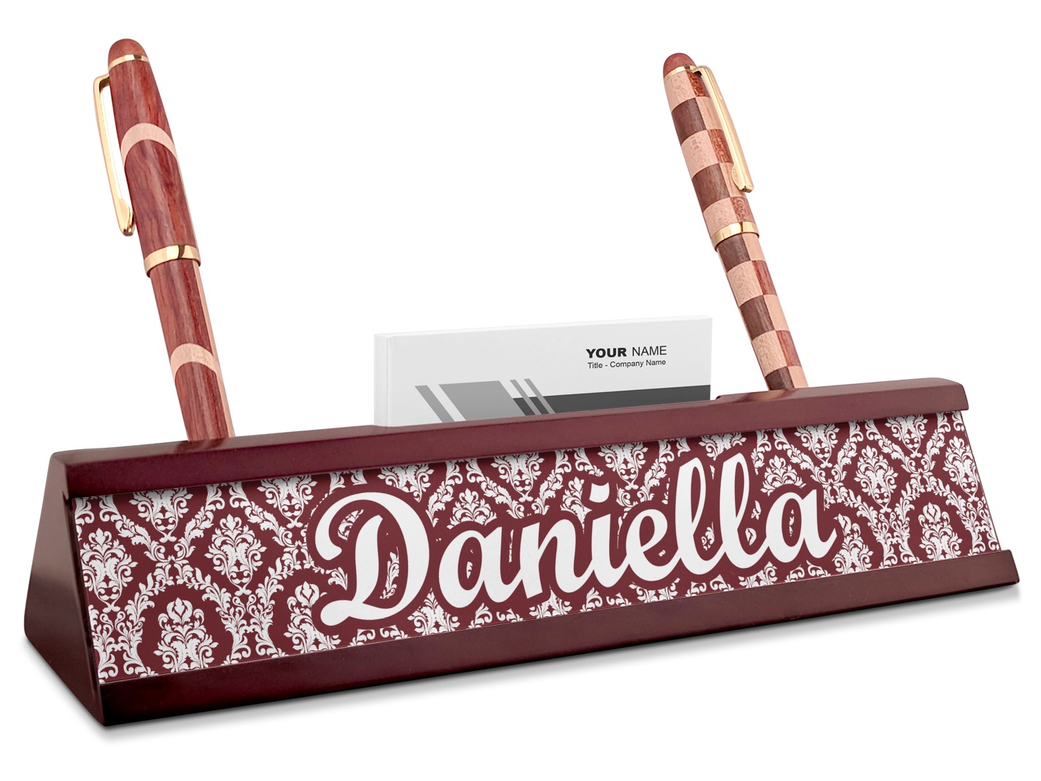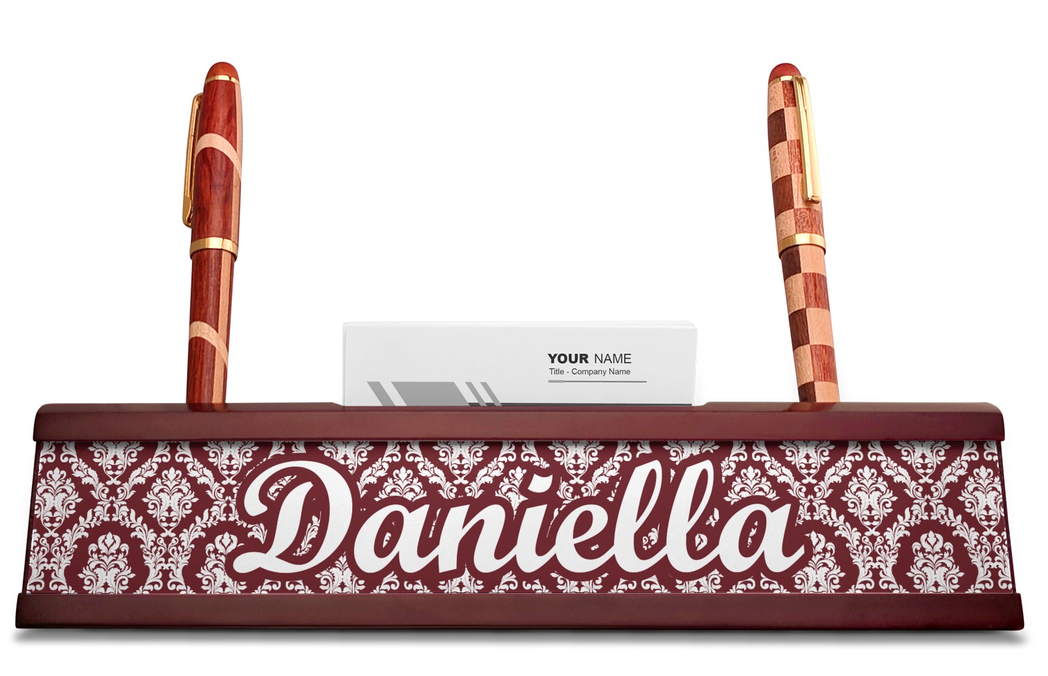 Your desk name plates are crafted from a high-quality, dark-cherry mahogany. At approximately 9.5 by 1.875 by 2.5 inches, this name plaque will fit perfectly, front and center, on your desk. Your customization spans across the entire face of the nameplate. Behind the nameplate lies a skinny slot that can fit approximately 15, traditionally-sized, business cards. You can also store your writing utensils on either side of this custom desk name plate.