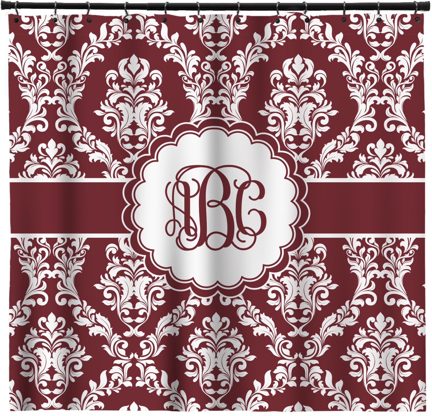 Maroon & White create a great combination. This simple, yet elegant design features our popular damask with a ribbon and an interlocking monogram in a scalloped label.