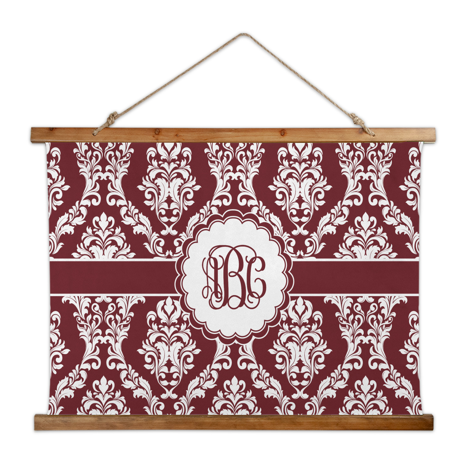 Made in two different orientations - portrait or landscape - both are 26" x 36". Your design is printed on a high quality polyester fabric with hemmed edges. The wood on the top and bottom of the tapestry is 1.25" tall and 0.25" thick and there are two pieces on top and bottom which sandwich the fabric.