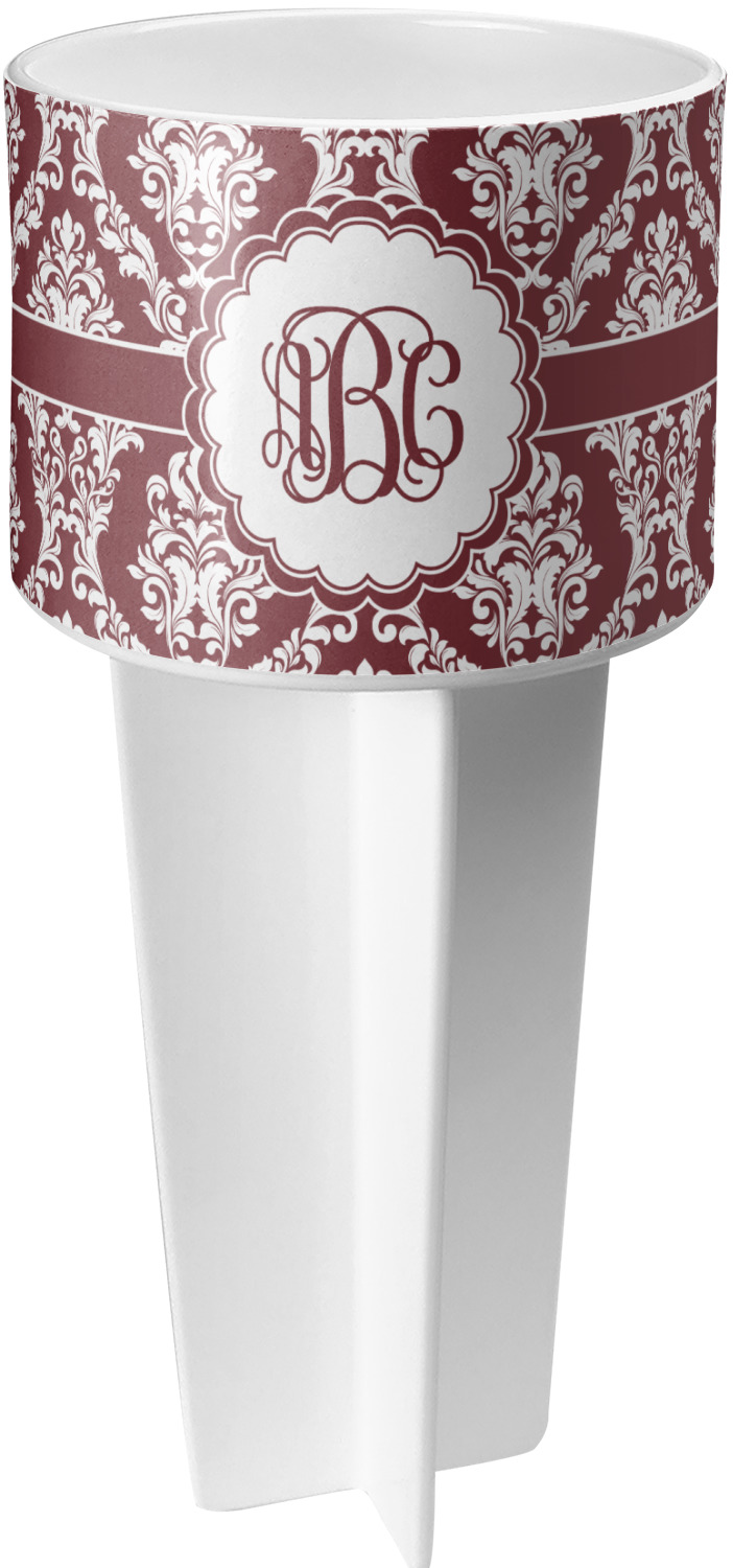 Maroon & White create a great combination. This simple, yet elegant design features our popular damask with a ribbon and an interlocking monogram in a scalloped label.