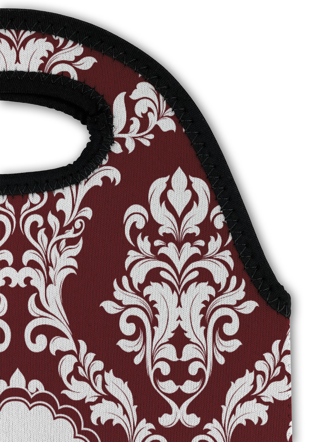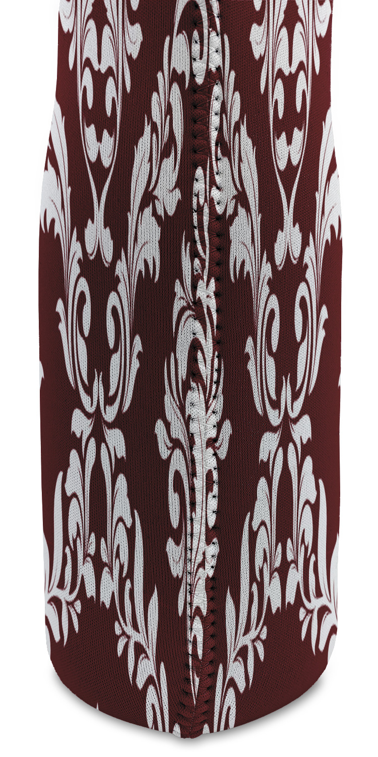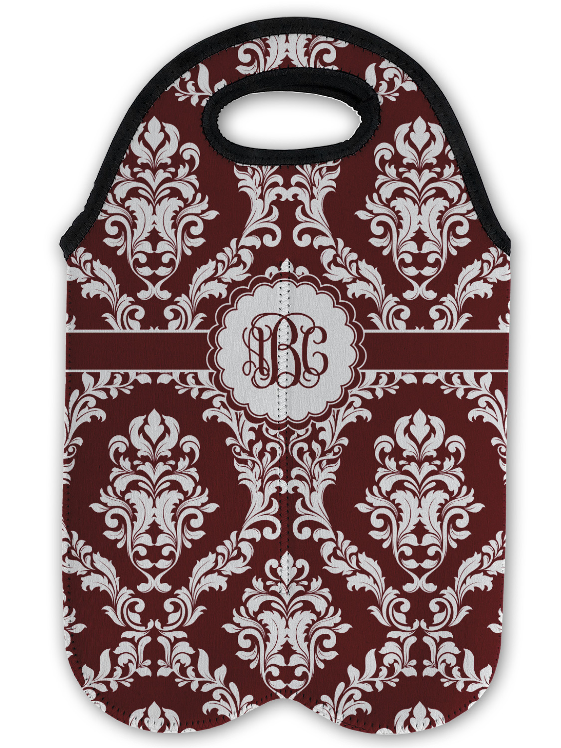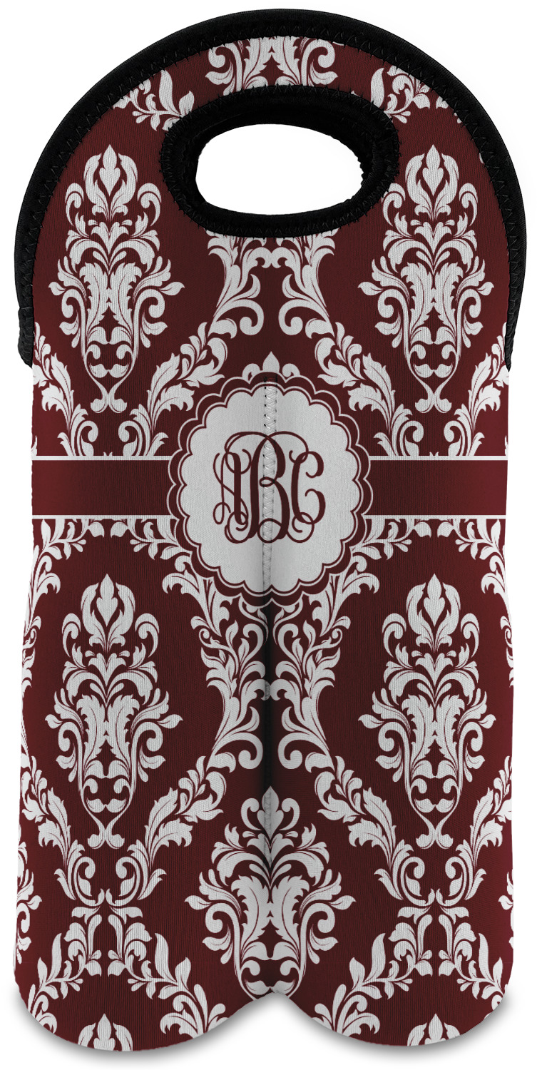 Maroon & White create a great combination. This simple, yet elegant design features our popular damask with a ribbon and an interlocking monogram in a scalloped label.