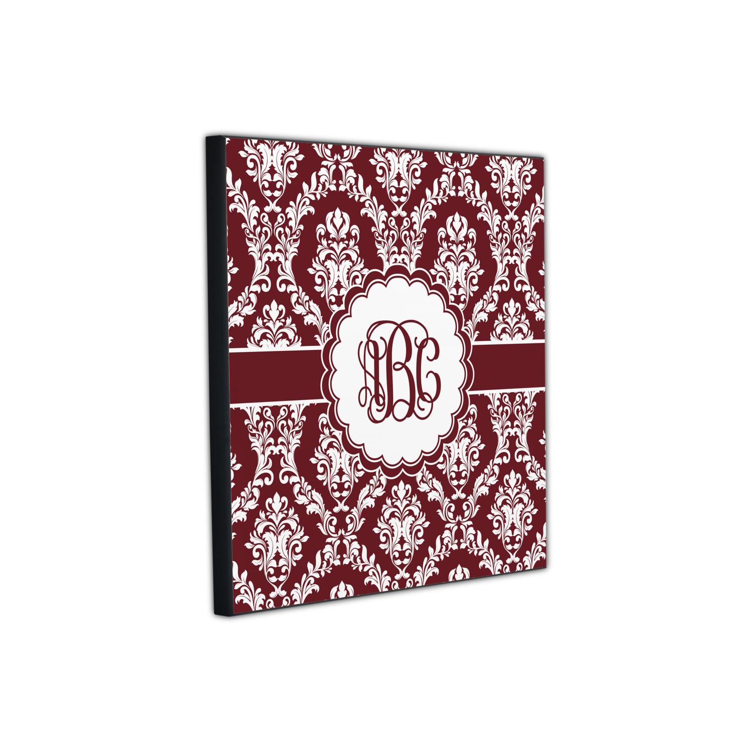 Maroon & White create a great combination. This simple, yet elegant design features our popular damask with a ribbon and an interlocking monogram in a scalloped label.