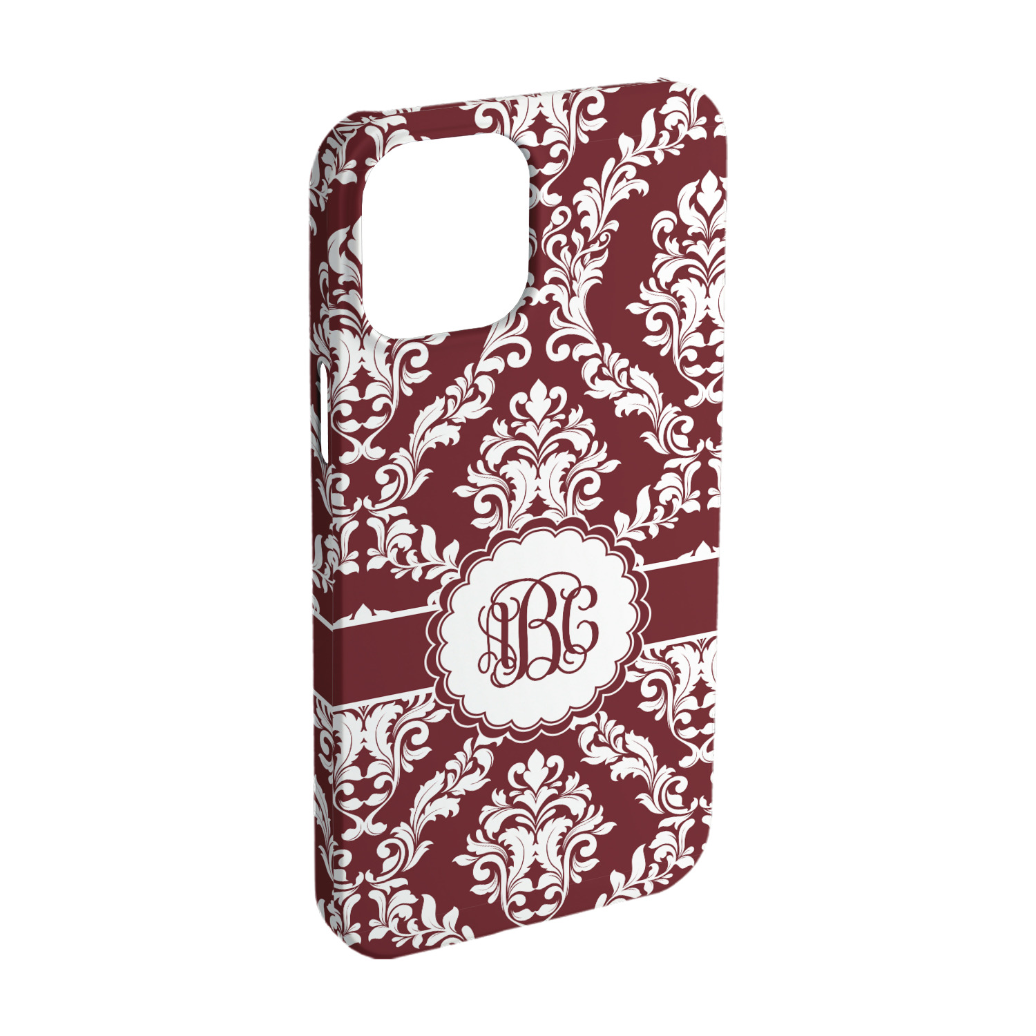 Maroon & White create a great combination. This simple, yet elegant design features our popular damask with a ribbon and an interlocking monogram in a scalloped label.