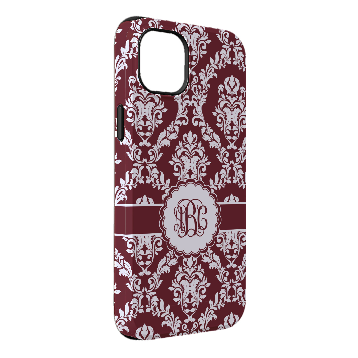 Maroon & White create a great combination. This simple, yet elegant design features our popular damask with a ribbon and an interlocking monogram in a scalloped label.