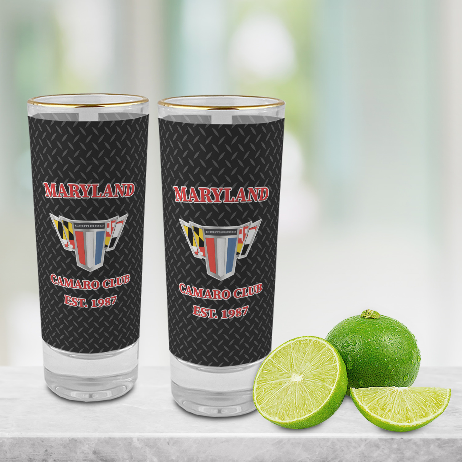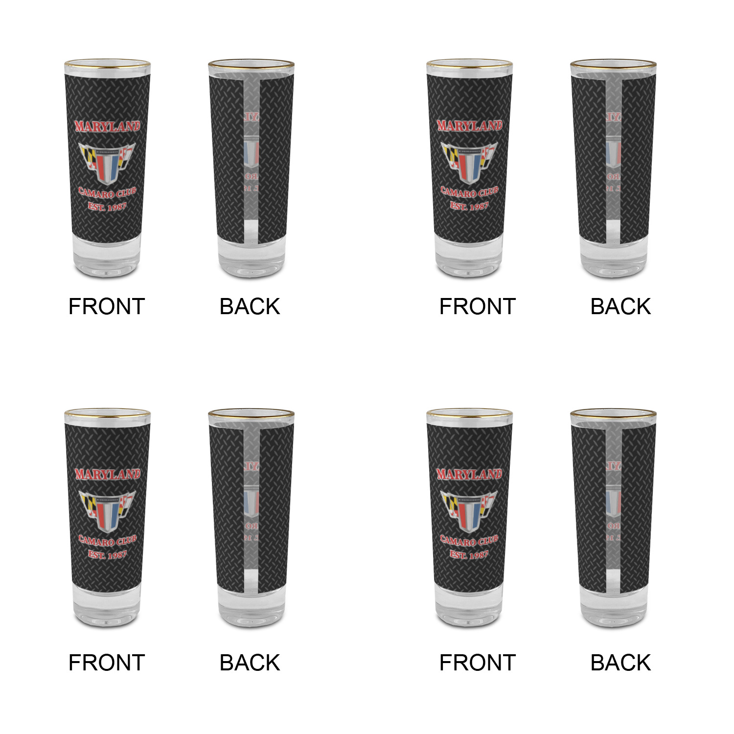 These glass shooter glasses are printed in full color with the design of your choice. These are a tall shooter 2 oz size and stand 4" tall. The print is a full wrap design to boldly display your personalization.