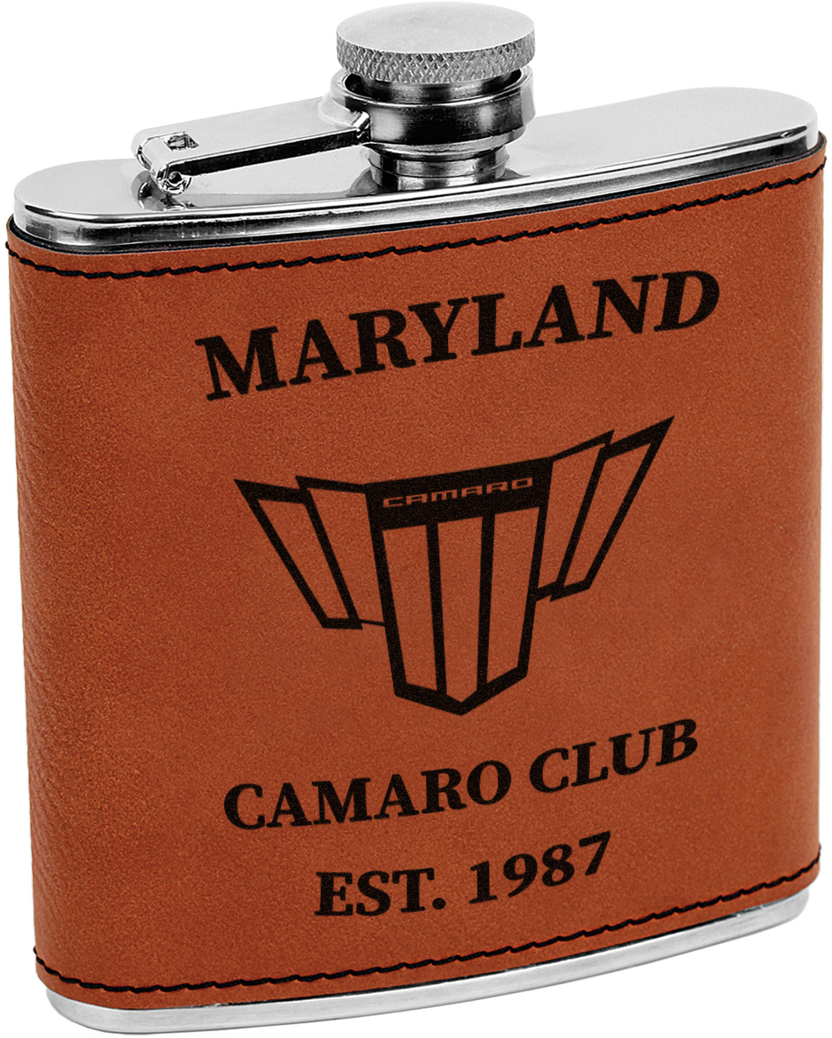 This custom flask is built from stainless steel, can hold 6 ounces, and is wrapped in a cognac-brown leatherette sleeve. The leatherette supplies a good grip on the liquor flask, while the slight curvature of the flask itself allows for a snug fit in your hand. Fine, black stitching lines the edges of the leatherette, adding to the durability of the material. This personalized flask features the traditional, screw and flip lid at its top, which prevents any unwanted spillage. Your customized design is precisely laser-engraved into the leatherette, leaving an elegant, dark-brown, almost black coloration.
