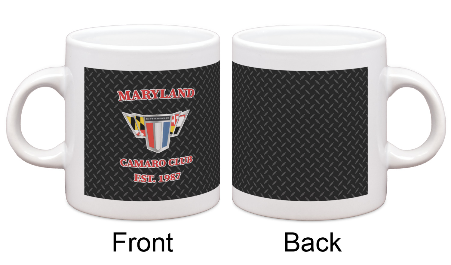 Each of our espresso mugs is a ceramic material sure to keep your drink warm. Personalize one cup for yourself, or order a set of 4! Its the perfect little gift for any coffee lover! We carry two sizes for you to personalize - 3 oz. (approx. 3.25" x 2.325" x 2.625") or 6 oz. (approx. 4" x 2.9" x 2.9"). Our 3 oz. mug is perfect for that single shot espresso while our 6 oz. mug can be your next favorite cappuccino cup holding two shots of espresso!