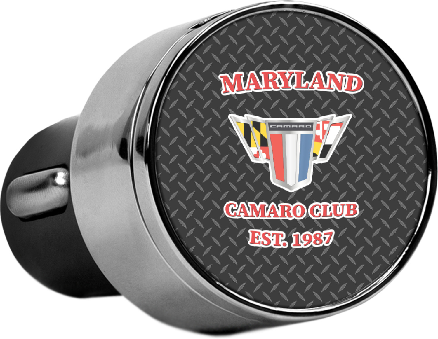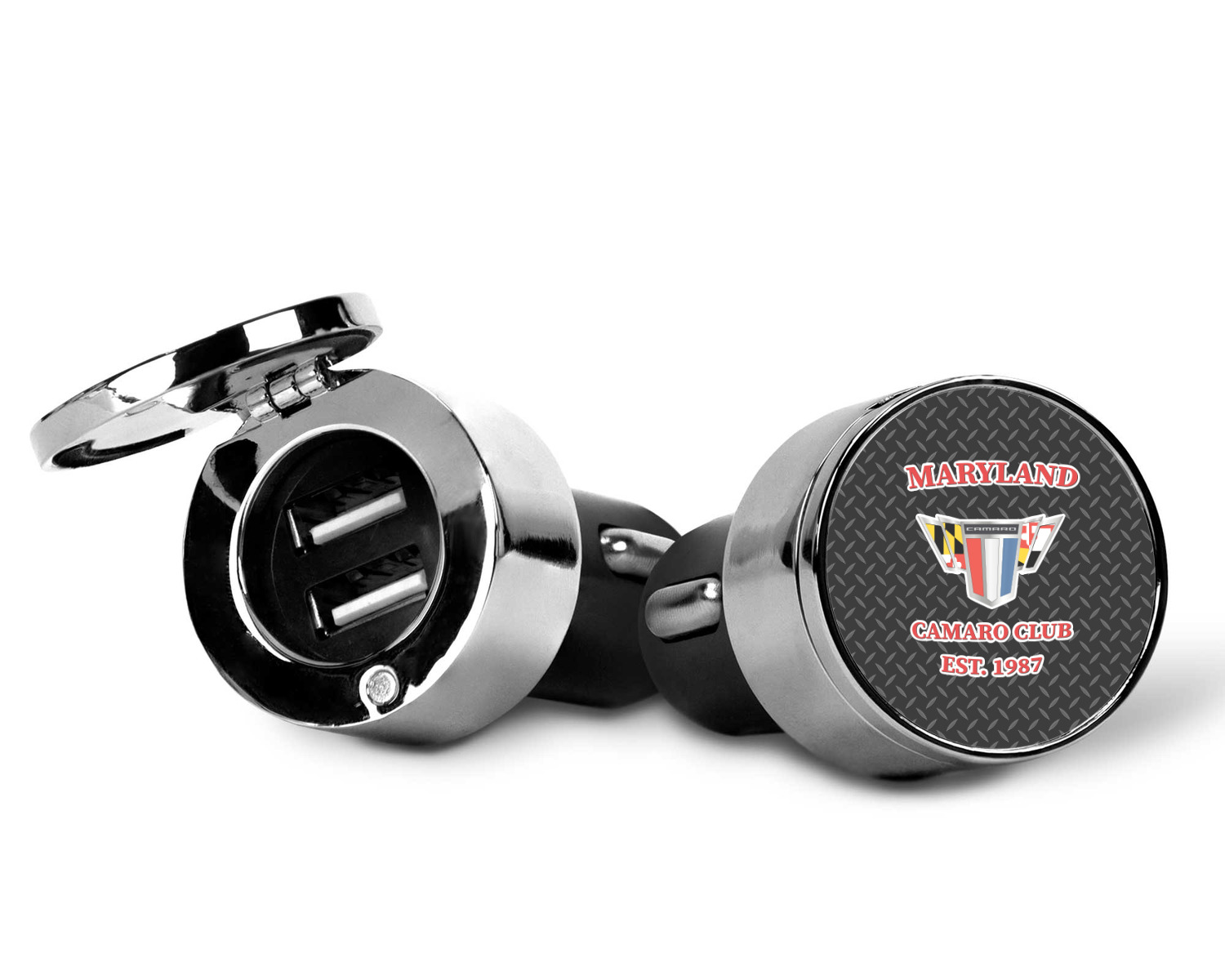 This car charger adapter converts your cars bland cigarette lighter into a decorative, personalized, and operational USB charging port. Made of solid, silver-plated metal, these chargers feature a flip-open lid that both displays your customized design and conceals two USB ports. The metal lid of the USB car charger adapter is 1.5" in diameter and seals due to a small, ingrained magnet on both the charger and its lid. The cigarette lighter insert, itself, is colored black.