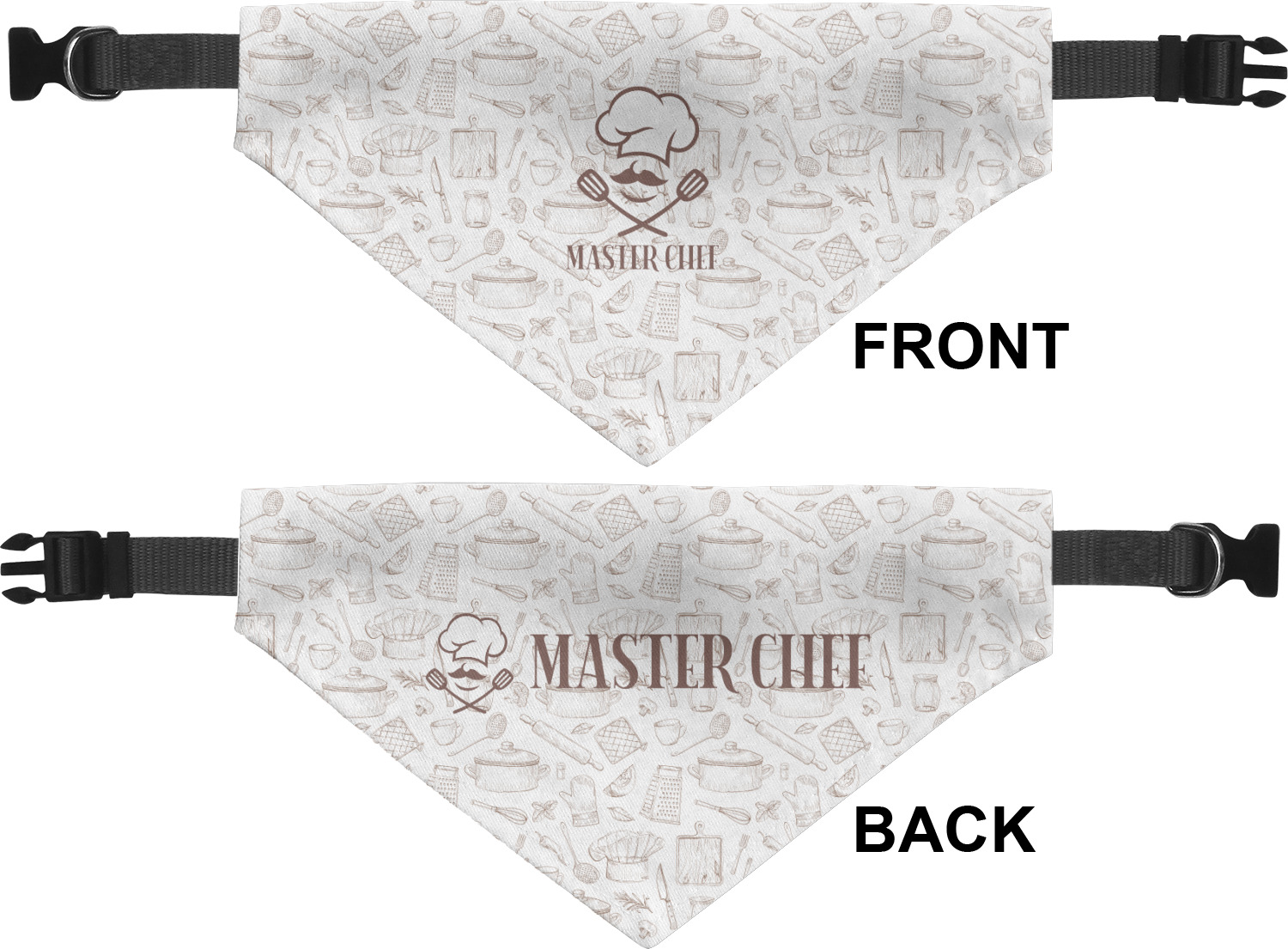 We print the front and back of these dog bandanas with your customized design. The bandana itself is made from a durable polyester, sewn together with a gap large enough to accommodate any collar. Regardless, the bandana includes a plain black, canvas collar with plastic snaps, that can easily be removed if desired. These dog bandana collars are available in four sizes: small, medium, large, and extra large. Please see our sizing chart for more information regarding the dimensions of each size.