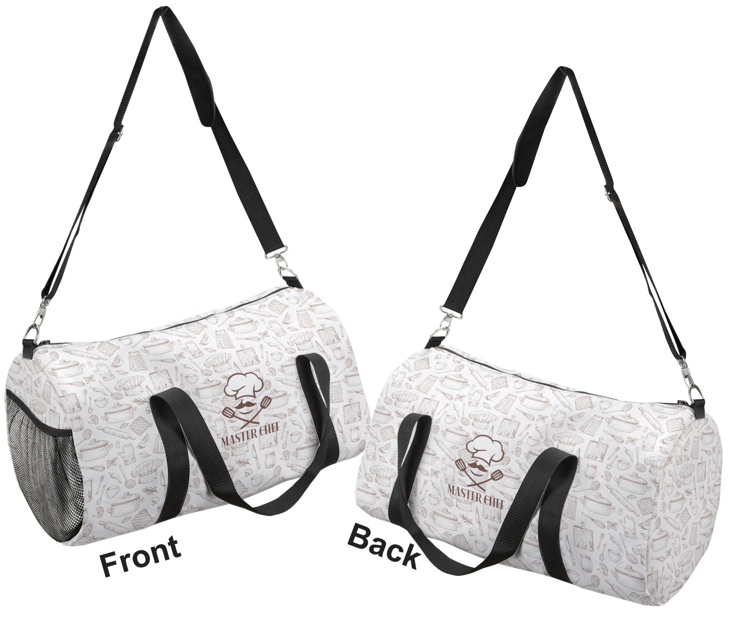 This duffle is a sturdy bag made of a canvas material. It comes in two sizes: Small (19"W x 9.5"H x 9.5"D) and Large (23"W x 12"H x 12"D). The bag is a cylindrical shape with a black adjustable strap and two handles. On one side is an elastic pouch to put a waterbottle or other small item. Your product will be sublimated with your design and is able to be designed on the front, back, and sides. Be sure to remember that the straps may cut into parts of your design if you upload your own artwork.