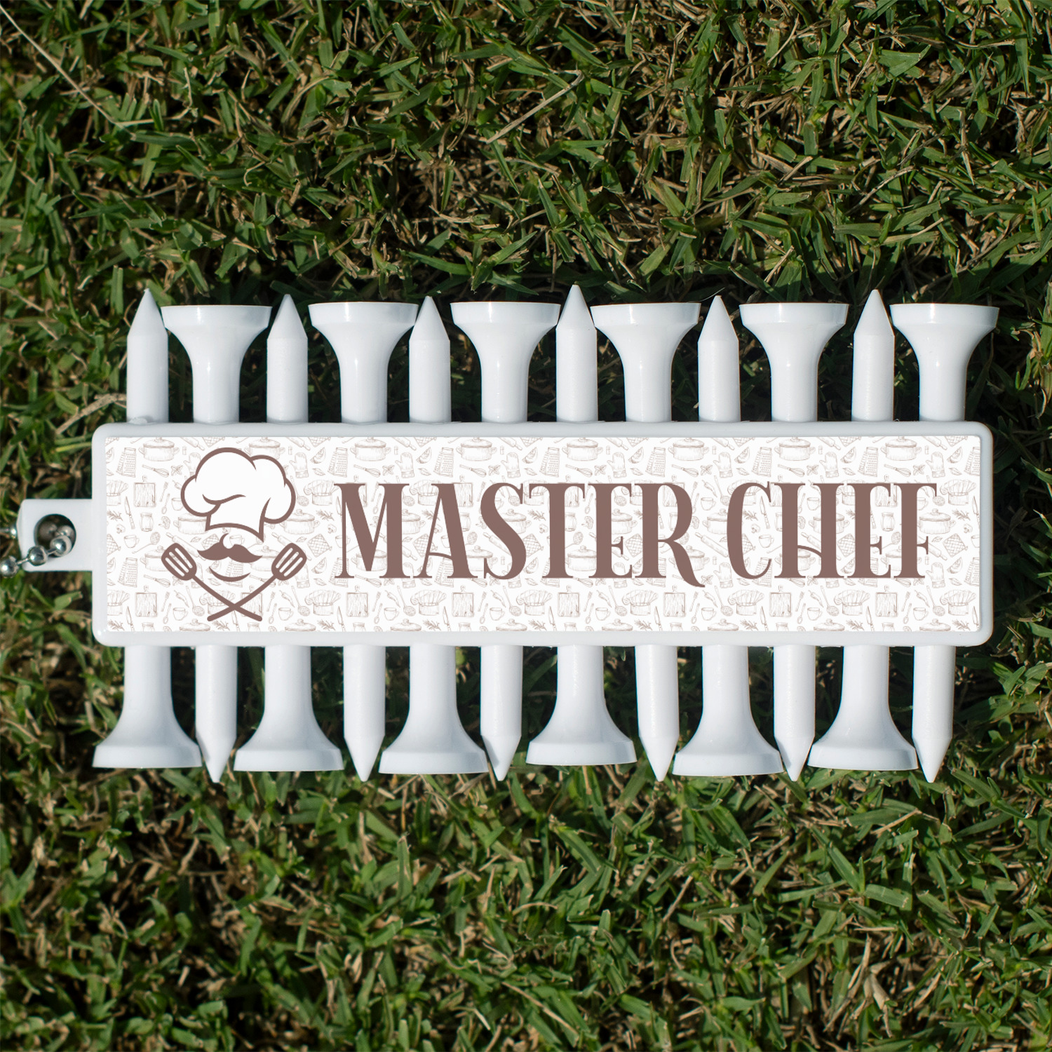 With 12 tees on a lightweight, portable key chain, it almost ensures a great 18 holes. Our tees are made of white plastic and are a little over 2". Design the front and the back of the golf tee holder. Pick from over a hundred designs, colors, and personalization styles! The set even comes with three removable ball markers as well!