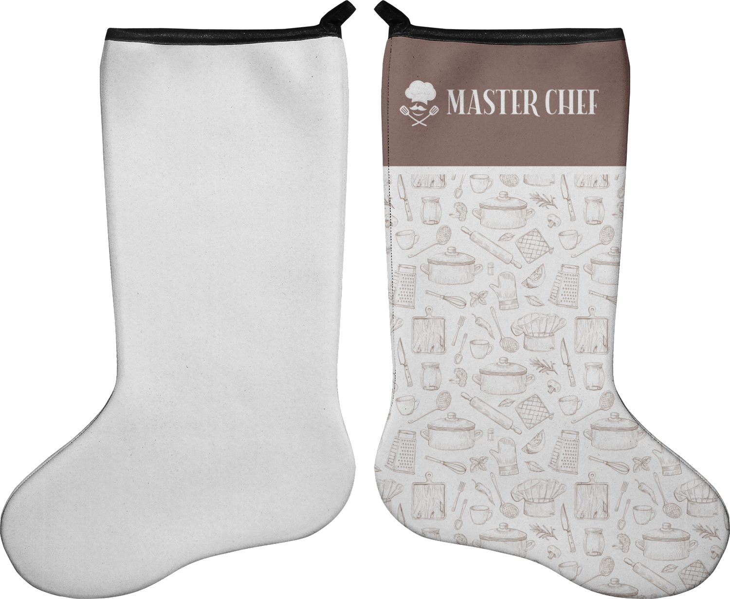 These 17" x 11" stockings are made of neoprene and have a black trim to give them a fantastic finished look. Your very own design is printed right onto the stocking, either single sided with white on the back or double sided where can use the same or different designs / patterns on the front and the back - the choice is yours. At the top of the stocking is a 2" loop for hanging.