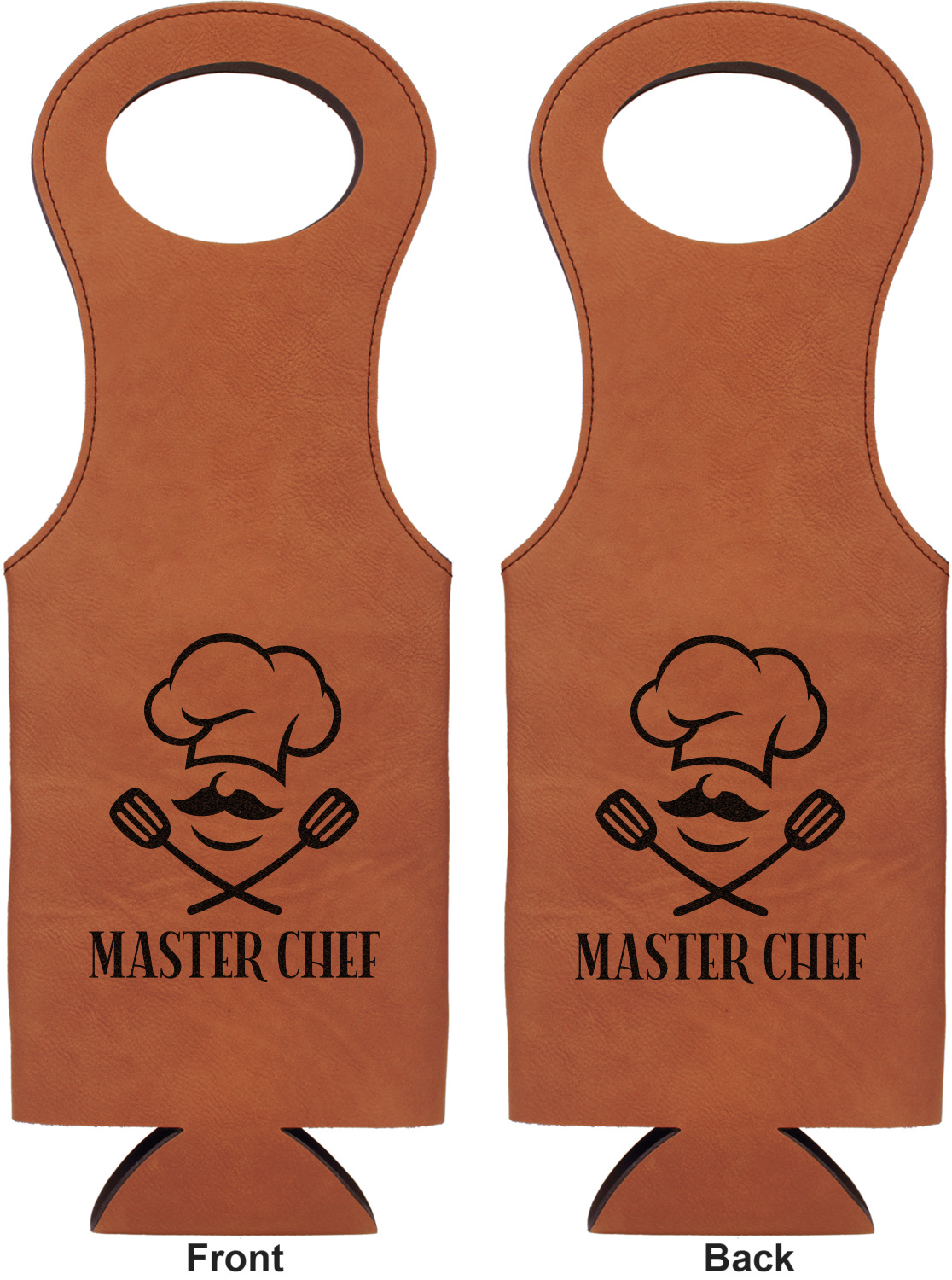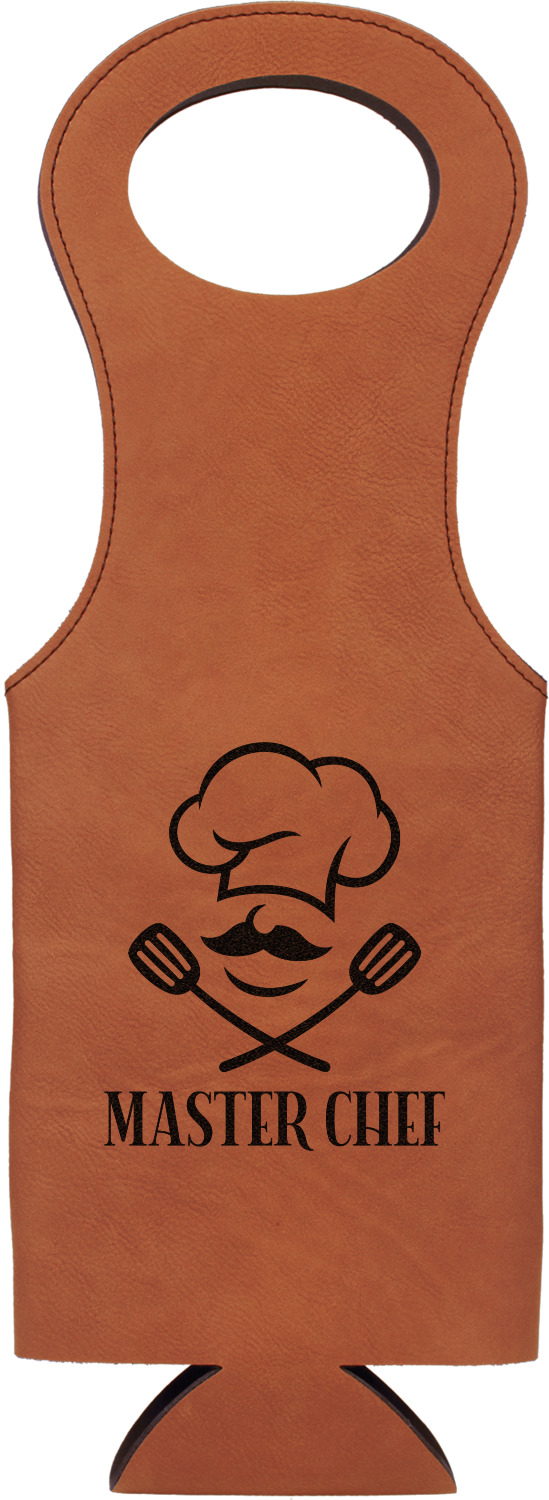 This wine carrier is made from a stunning leatherette, in a cognac-brown color. Strong, black stitching lines the sides of your wine bottle bag and provides extra durability. The interior is lined with a padded, black material to allow for a snug fit once your bottle is placed inside. At the top of this wine gift bag, you'll find two oval shaped handles that elegantly complements the rest of the bag's style. We provide you with the option of laser-engraving the front, or the front and back of your new personalized wine bag!