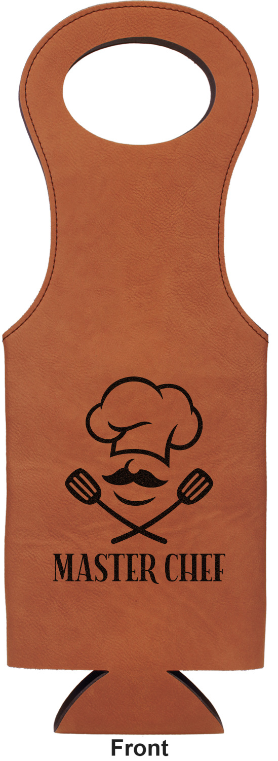 This wine carrier is made from a stunning leatherette, in a cognac-brown color. Strong, black stitching lines the sides of your wine bottle bag and provides extra durability. The interior is lined with a padded, black material to allow for a snug fit once your bottle is placed inside. At the top of this wine gift bag, you'll find two oval shaped handles that elegantly complements the rest of the bag's style. We provide you with the option of laser-engraving the front, or the front and back of your new personalized wine bag!