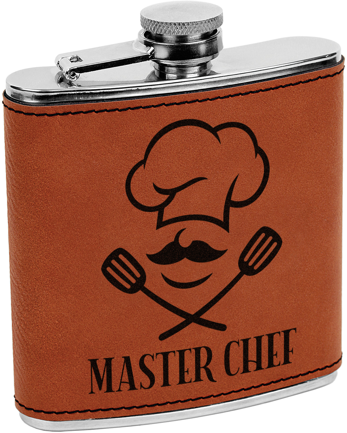 This custom flask is built from stainless steel, can hold 6 ounces, and is wrapped in a cognac-brown leatherette sleeve. The leatherette supplies a good grip on the liquor flask, while the slight curvature of the flask itself allows for a snug fit in your hand. Fine, black stitching lines the edges of the leatherette, adding to the durability of the material. This personalized flask features the traditional, screw and flip lid at its top, which prevents any unwanted spillage. Your customized design is precisely laser-engraved into the leatherette, leaving an elegant, dark-brown, almost black coloration.