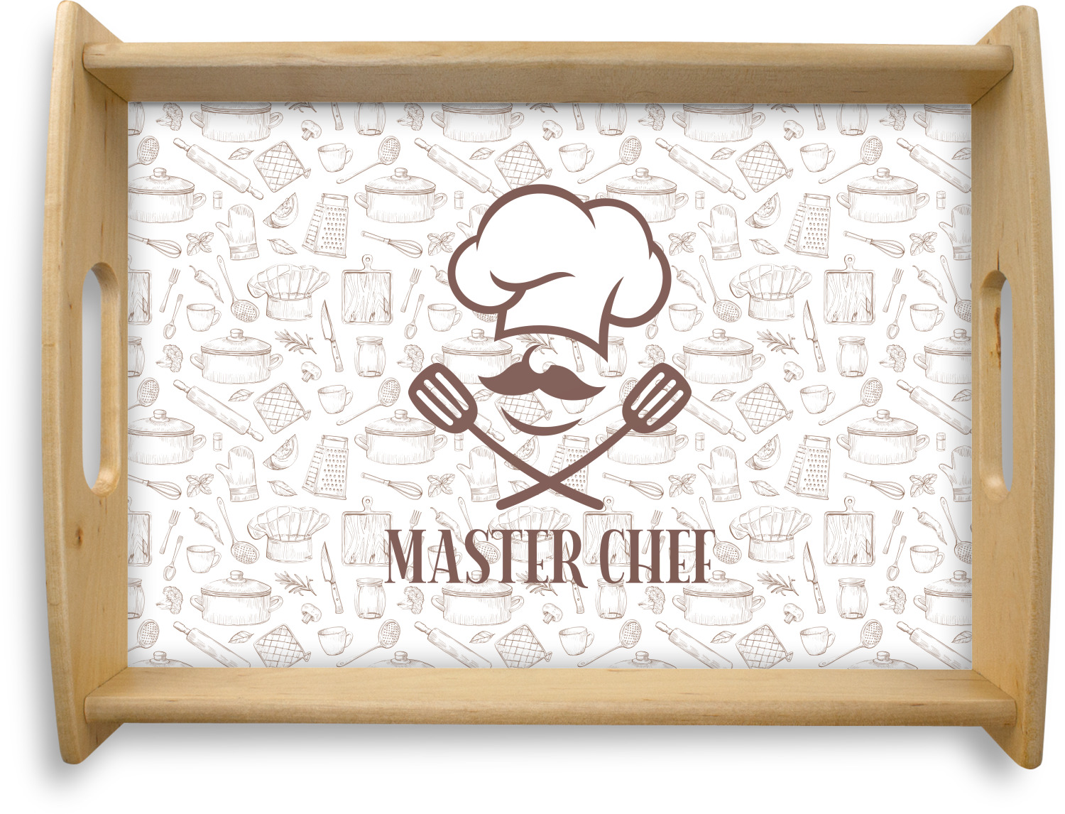 This serving tray with handles features square edges and two rounded sides, creating a very modern look. Each side is fabricated from a beautifully cut, natural wood. The bottom of the interior of the tray displays your customized design in bright, vibrant color. The tray is sold in both a black color and a natural wood look. Each variation of the wood serving tray has two sizes: Small, which is 14" x 10" x 2.25", and Large, which is 19.5" x 13.5" x 2.75".