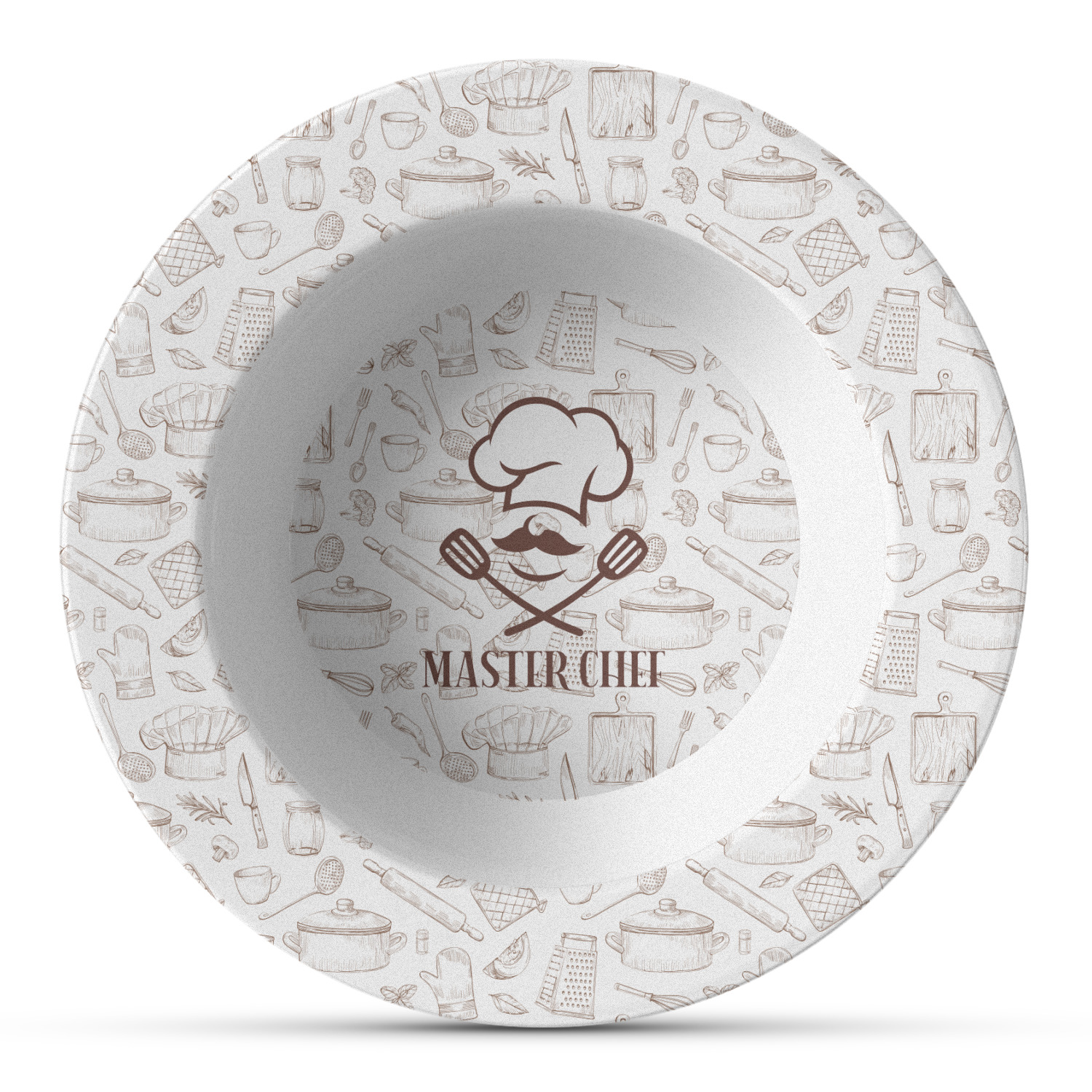 Made from a composite, thermo-set, polymer plastic, these dinner bowls have the versatility, durability, and weight of a melamine bowl without any of the downsides of melamine. Unlike melamine dinnerware, these bowls can withstand high heat. These custom plastic bowls can even handle temperatures of up to 250 degrees Fahrenheit, for up to 60 minutes. The pieces of our plastic dinner set are never made with harmful chemicals, such as BPAs, formaldehyde, DEHPs. We display your personalization on the base of this bowl's interior, while the bowl itself has an 8.75" diameter and is 1.75" tall.