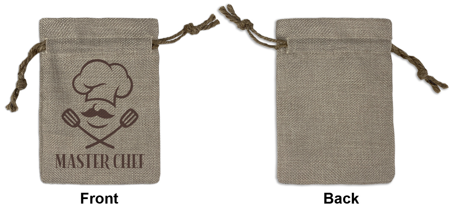 We sell our Burlap Gift Bags in 3 variant sized bags. Made with burlap polyester, each personalized bag can be secured with a twine drawstring pull. Your custom design is available to print on one side or both sides - completely up to you! The sizes of the bags measure approximately 4.5" x 6.5" for the smallest size, 6.5" x 8.0" for the medium size, and 6.5" x 13.5" for the large-sized bag.