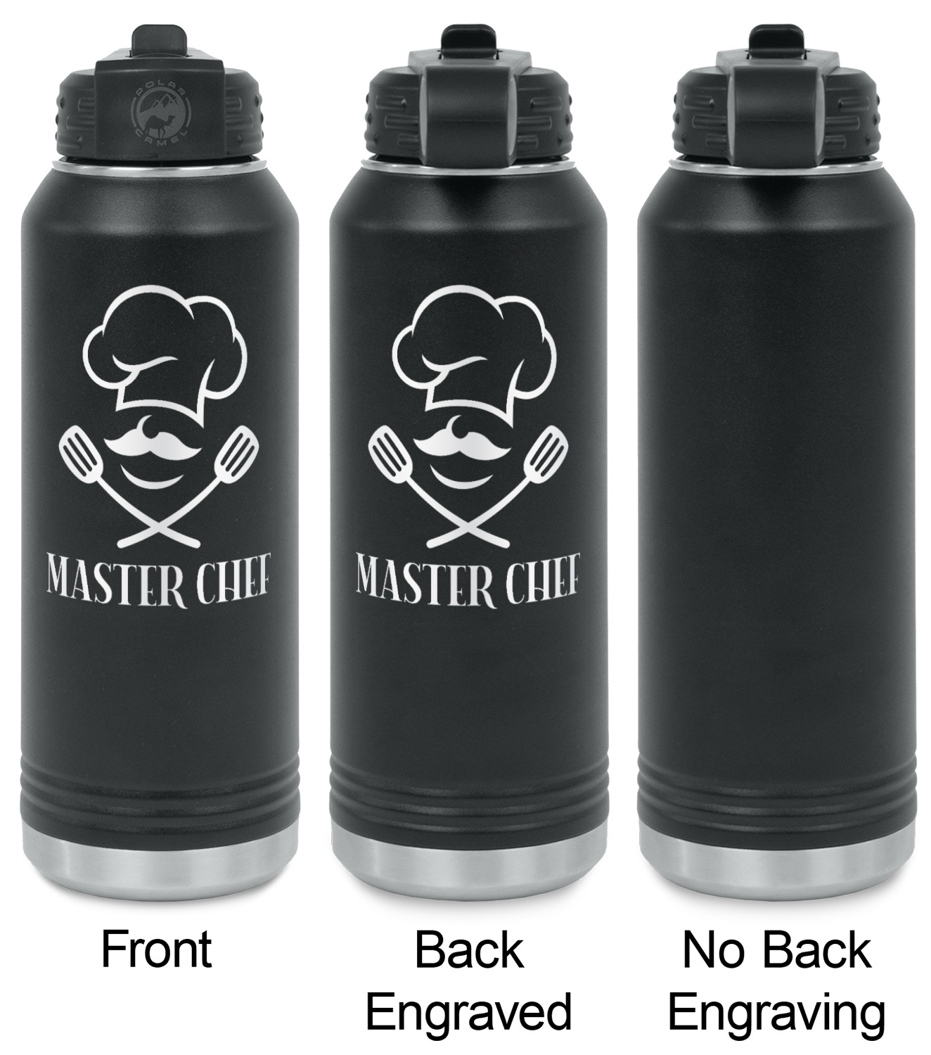 Your design is laser engraved on the water bottles. The engraving removes the black powder coating in the designed area to expose the silver stainless steel underneath.