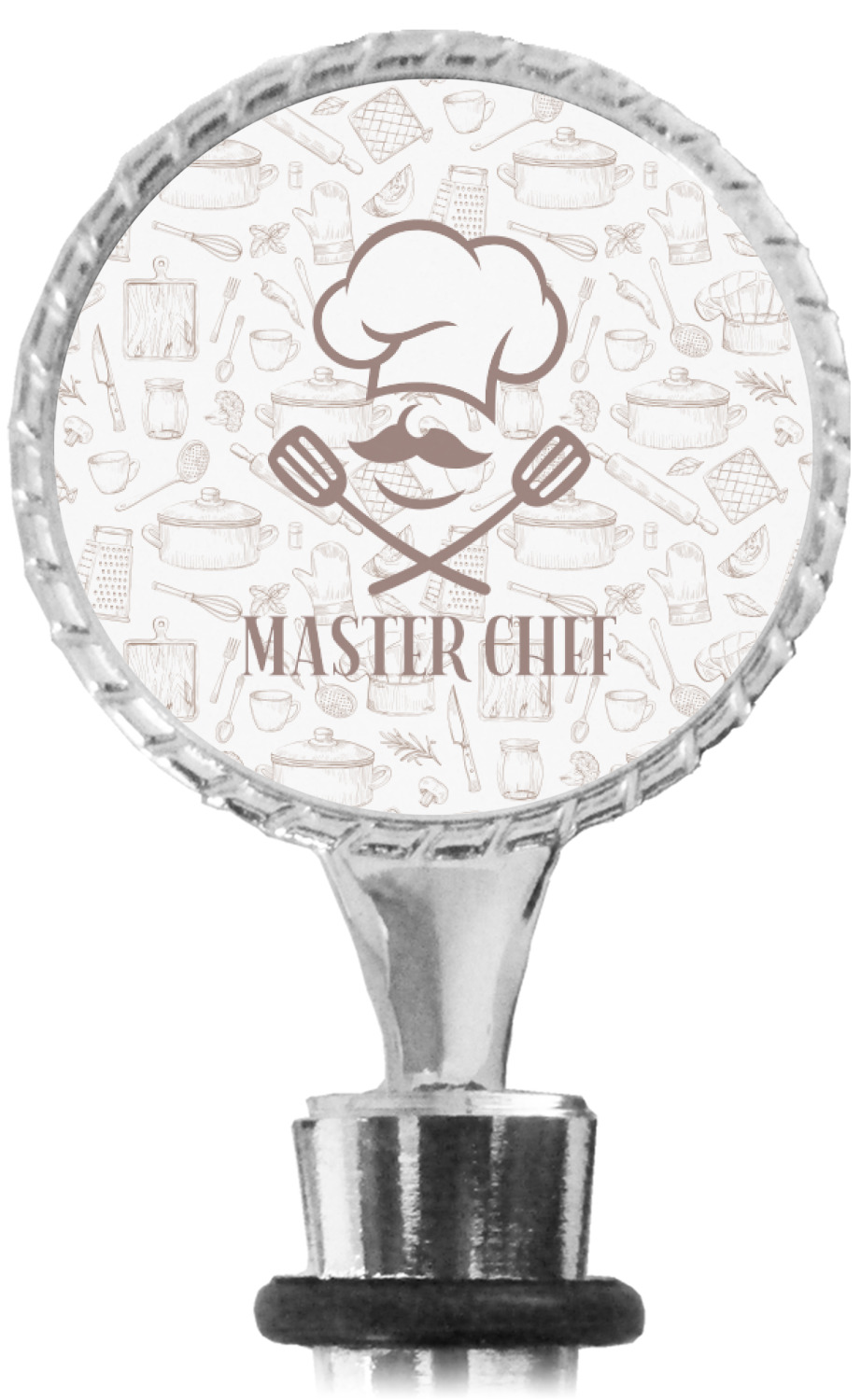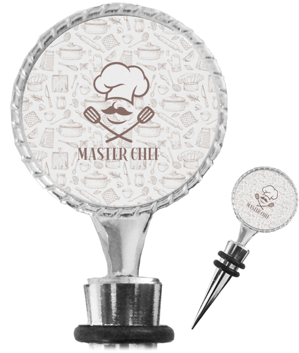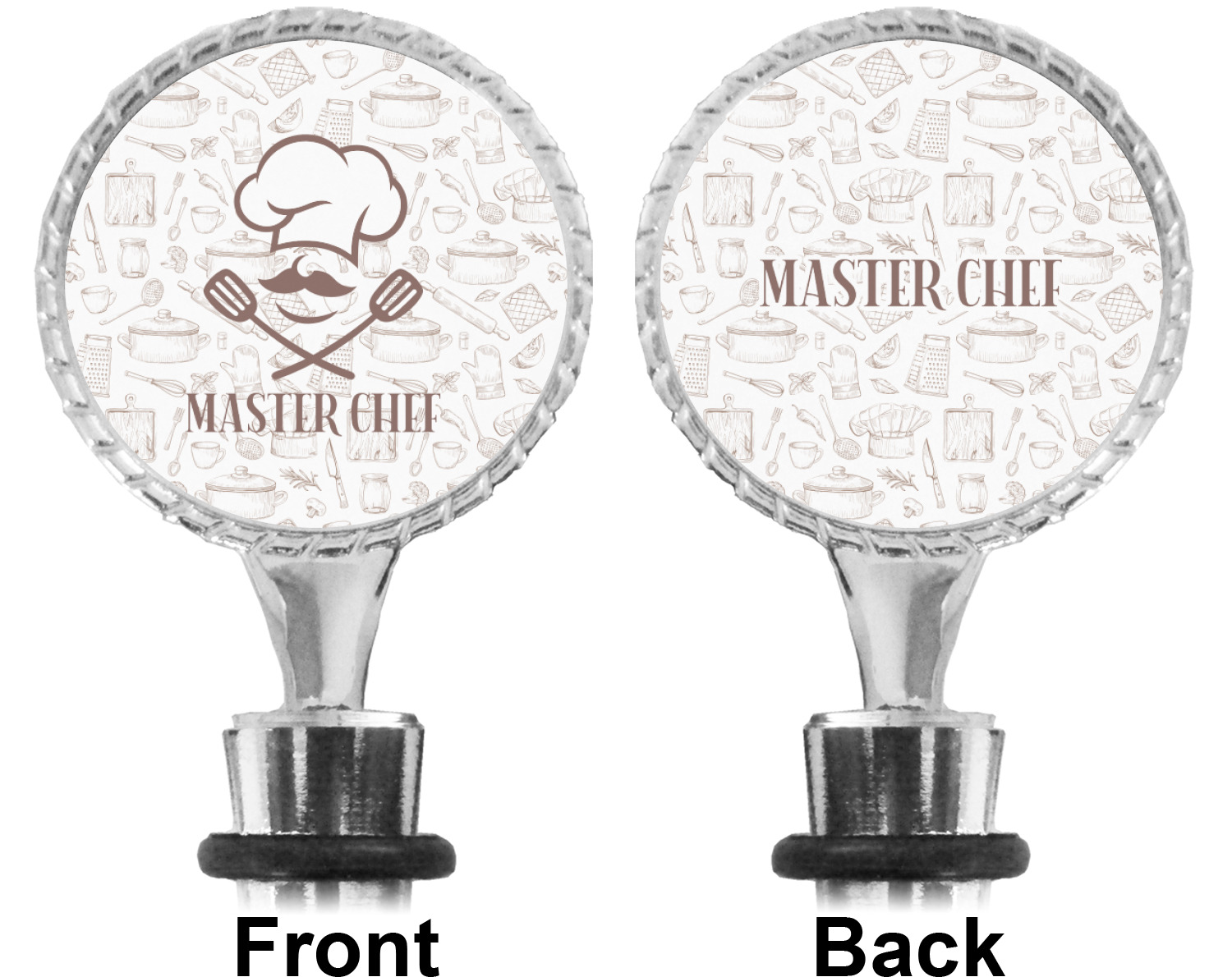 The top part of your bottle stopper is comprised of a zinc ring that displays your customization(s) in its middle, on both sides. The ring is heavy duty, with a bright chrome finish. The body of the wine stoppers have two silicone rings to provide an airtight seal. These wine bottle stoppers measure at 1.625" L x 0.8125" W x 4.625" H; your custom wine stopper is meant to fit into most standard-sized wine bottles.