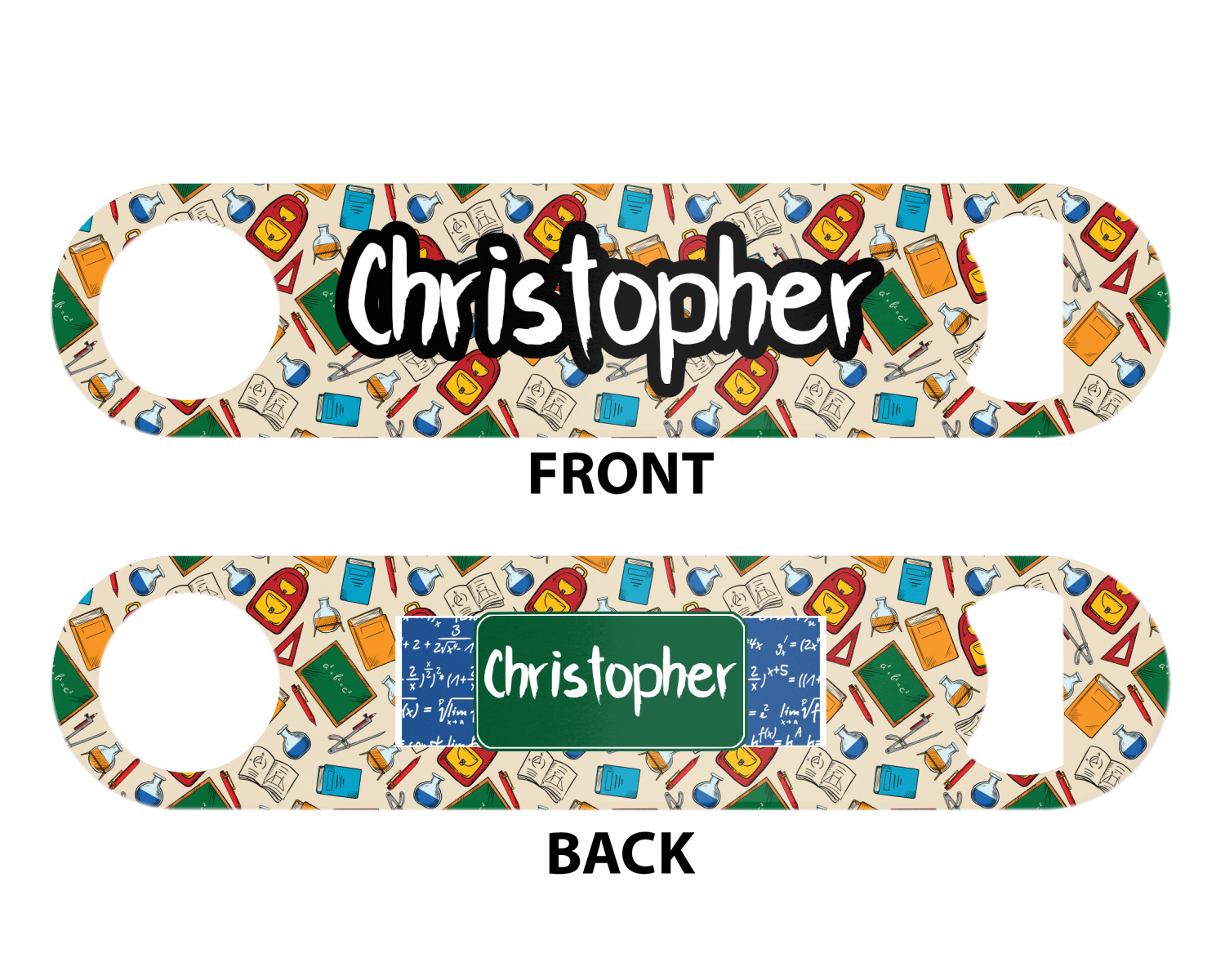 Made from stainless steel, these beer bottle openers are 7 by 1.625 inches, giving you plenty of leverage when trying to open a stubborn bottle. On one end of this personalized bottle opener, you'll find a circular hole for you to hang and display your opener. On the opposite end, you'll find the tool used for opening bottles. This opener in particular has the same structure and style as professional bartender bottle openers. Your customization is sublimated onto both the back and front, and both sides can be customized individually. Choose from one of our two base colors - white or silver.