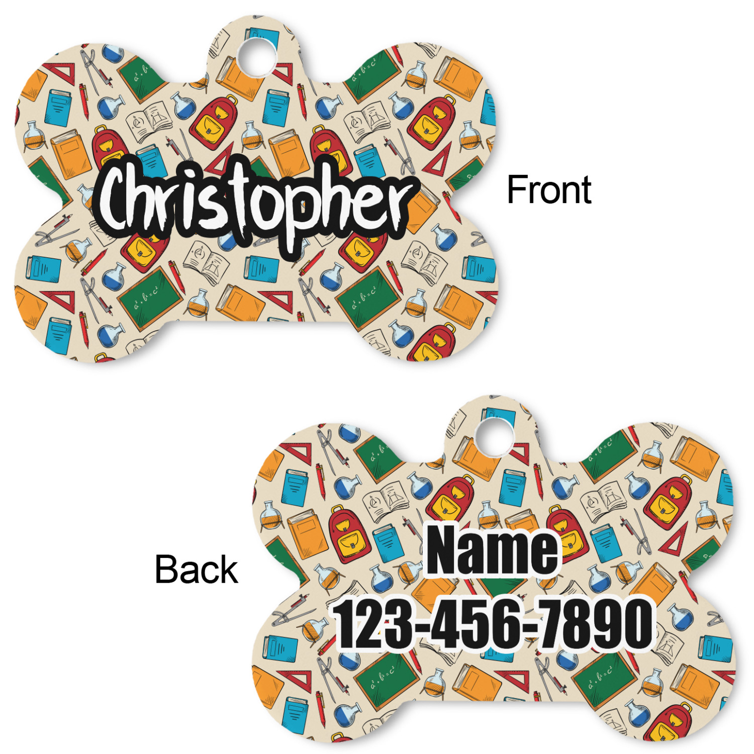 Our default design templates print your dog's personalization on the front and your contact information on the back; however everything is customizable, so you customize the patterns, the colors, the personalization, the contact information etc.