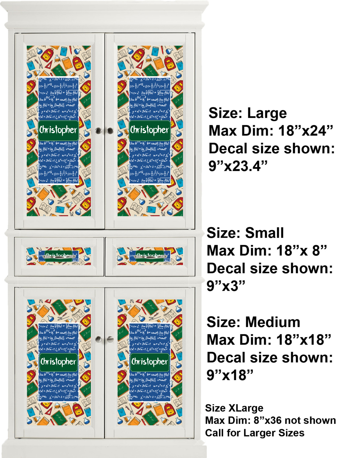 We print your customized design in full color, onto a high quality vinyl, covered with a glossy finish. For attachment to the cabinet, each cabinet sticker is accompanied by an easily applied, adhesive backing. The adhesive backing also guarantees a smooth removal or repositioning if desired. We sell these decals in four different sizes, but each size can be downsized appropriately to fit the needs of your kitchen. We offer a small, which is 18 by 8 inches, a medium, which is 18 by 18 inches, a large, at 24 by 18 inches, and an extra large, at 36 by 18 inches. We advise that you measure your cabinets first so you can make a properly informed purchase. For those who are interested in purchasing decals larger than 18 by 36 inches, please contact our team.