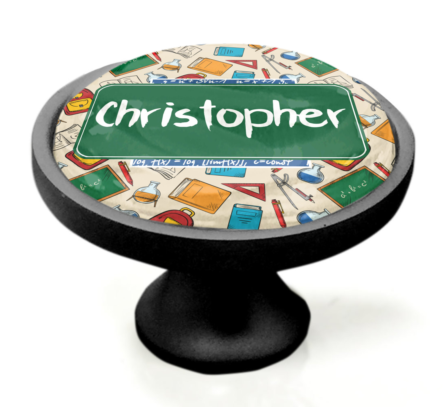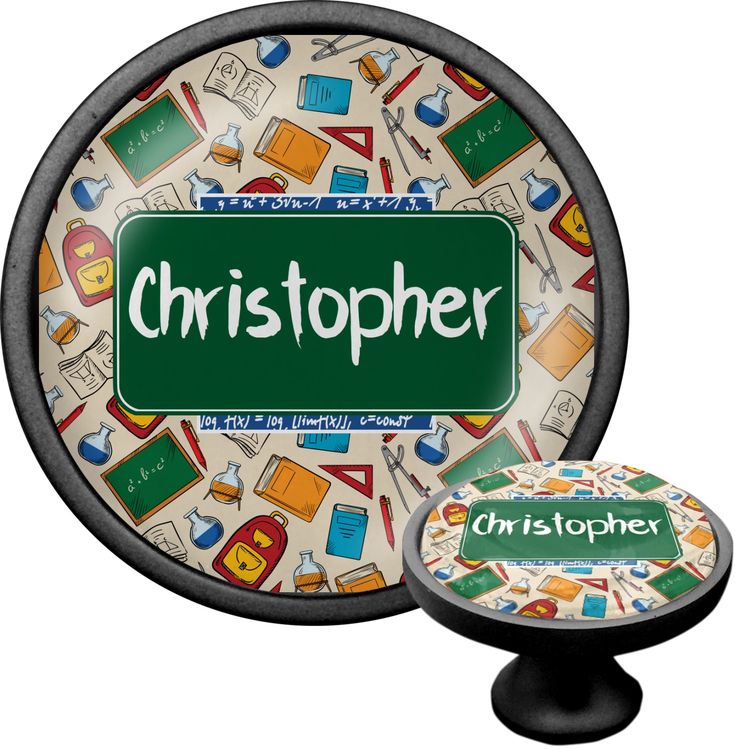 We sell these cabinet pulls in two different colors to better match your room's color scheme. We offer an oil-rubbed bronze base that is black in color, and a satin nickel option, which has a silver color. Your design is displayed across a high gloss vinyl insert that is placed on top of these cabinet handles. We then place a 1 inch thick glass cabochon atop the design, which seals the cabinet knob and makes the colors of your customization stand out. These custom cabinet knobs are approximately 1.3 inches in diameter. Your purchase includes a 1 inch screw that can be used to mount the knob to any cabinet in your home.