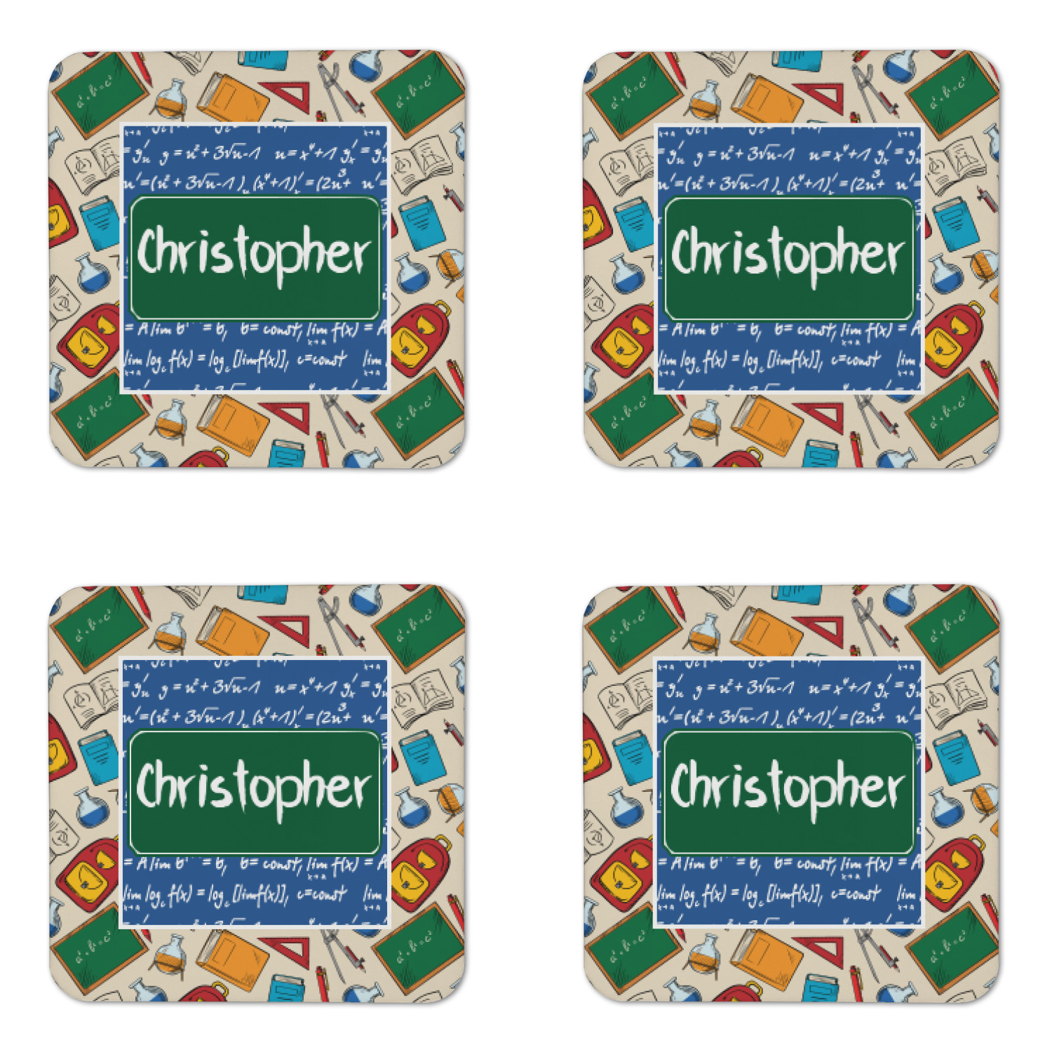 The first pattern is filled with fun graphics from backpacks to chalk boards to books and beakers. The color palette consists of a nice neutral cream with pops of red, green, blue, and yellow. The second pattern is a blue background with white formulas written all across it like a chalkboard.