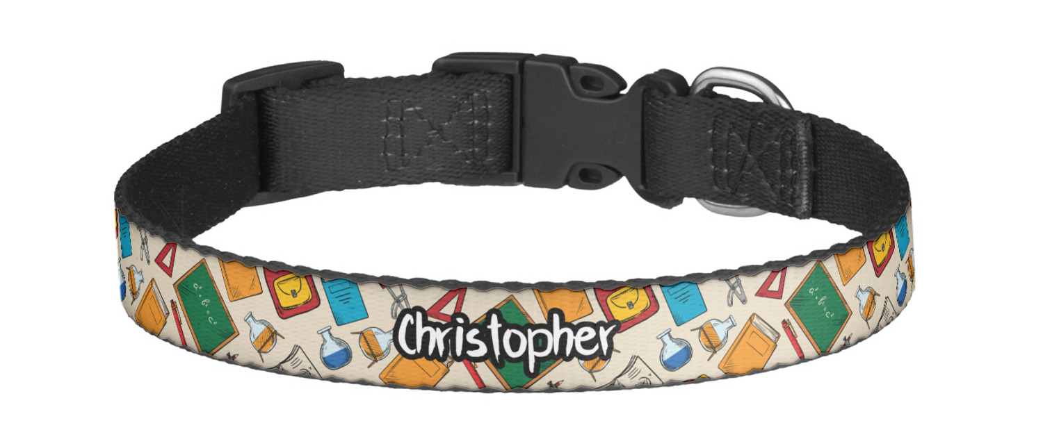 This sturdy collar, made from a durable nylon weave, will outlive your dog's episodes of excited tugging and pulling. Courtesy of its thick plastic buckle and adjuster, this collar is adjustable and accommodating of any dog. Structurally, the collar is a single piece of nylon weave that is sewn together, and features a solid metal loop where you can attach a leash or dog tag. We print and display your dog's name and pattern across the middle of the personalized dog collar.