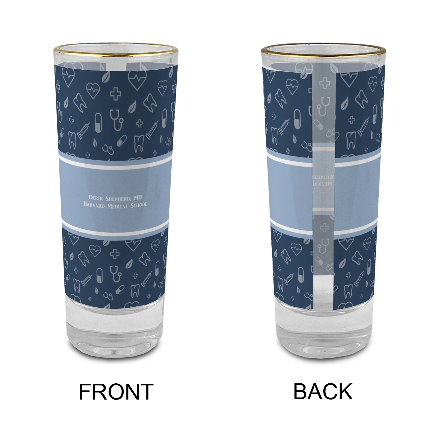 These glass shooter glasses are printed in full color with the design of your choice. These are a tall shooter 2 oz size and stand 4" tall. The print is a full wrap design to boldly display your personalization.