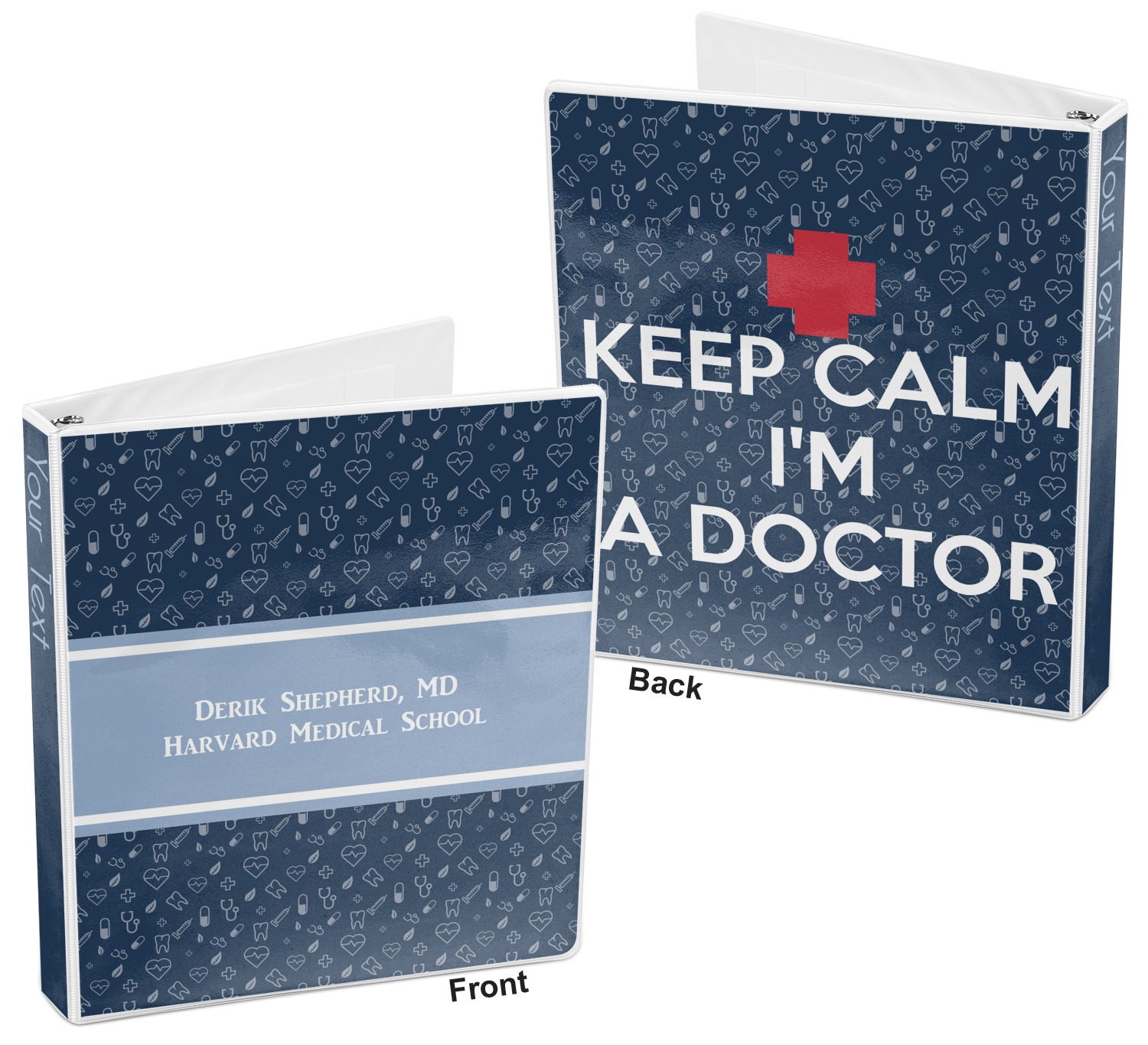This design features a subtle background with different medical symbols. It is a navy blue with cream accents. There is a large ribbon where your personalization goes! The coordinating design features a quote that says "keep calm, I'm a doctor." This is such a fun design for any medical doctor!